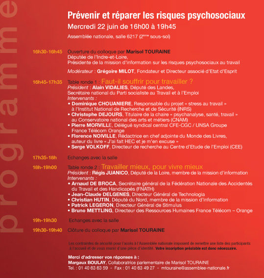 La « vague de suicides » à France Télécom a révélé à l’opinion l’ampleur des risques psychosociaux au travail. L’émotion qui s’est emparée de notre pays à cette occasion traduit le malaise croissant des salariés dans leur rapport au travail, qui ne joue plus son rôle d’émancipation tant personnelle que sociale. Les socialistes ont la volonté d’apporter des réponses fortes et volontaristes à la montée de ces phénomènes de souffrances au travail. La Fondation Jean-Jaurès et le groupe socialiste ont organisé un colloque le mercredi 22 juin à l’Assemblée nationale pour apporter des réponses fortes et volontaristes à la montée de ces phénomènes de souffrances au travail.
