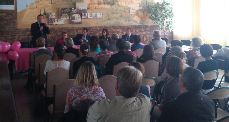 OctobreRose2014.2Cette présentation s’est faite en présence de représentant-e-s de la Ligue contre le cancer, de la Mutualité Française, de la MGEN, du Centre Hygée, de sans doute Vivre !, de l’entreprise SIGVARIS, de la mairie de Saint-Etienne, ainsi que de la minoterie Dupuy Couturier et de la boulangerie Ravel de Saint-Priest-en-Jarez.