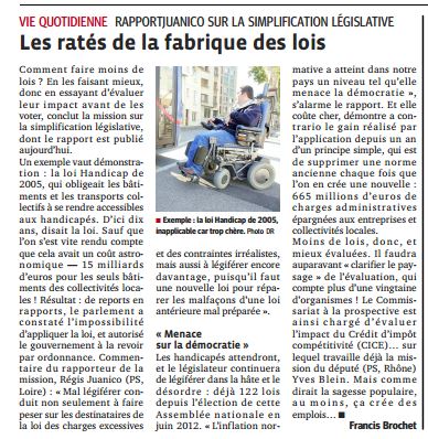 Rapporteur d’une mission d’information sur la simplification législative, présidée par Laure de la Raudière (UMP, Eure-et-Loire), le socialiste Régis Juanico (Loire) apporte, dans un rapport rendu public mercredi 8 octobre, sa petite pierre à l’édifice du « choc de simplification » souhaité par l’exécutif.