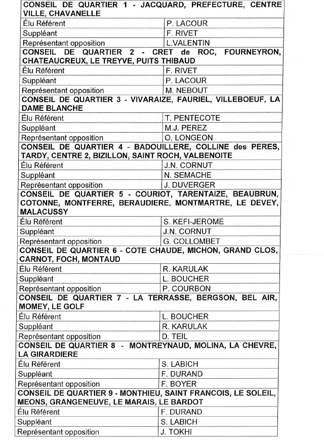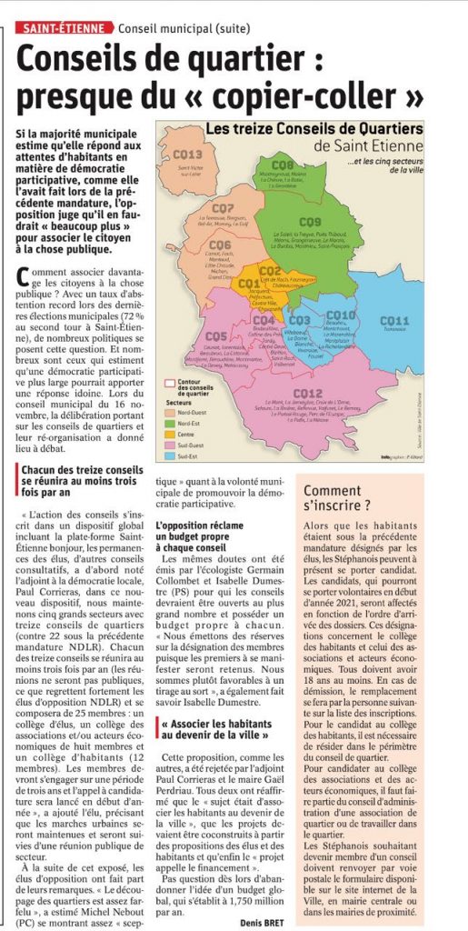 Selon le site de la Ville de Saint-Etienne, « les conseils de quartier de la Ville de Saint-Etienne sont des lieux d’échanges et de propositions où les habitants peuvent donner leur avis et élaborer des projets. Les participants sont invités à s’exprimer sur tous les aspects de la vie de leur quartier afin de favoriser une démocratie de proximité. »