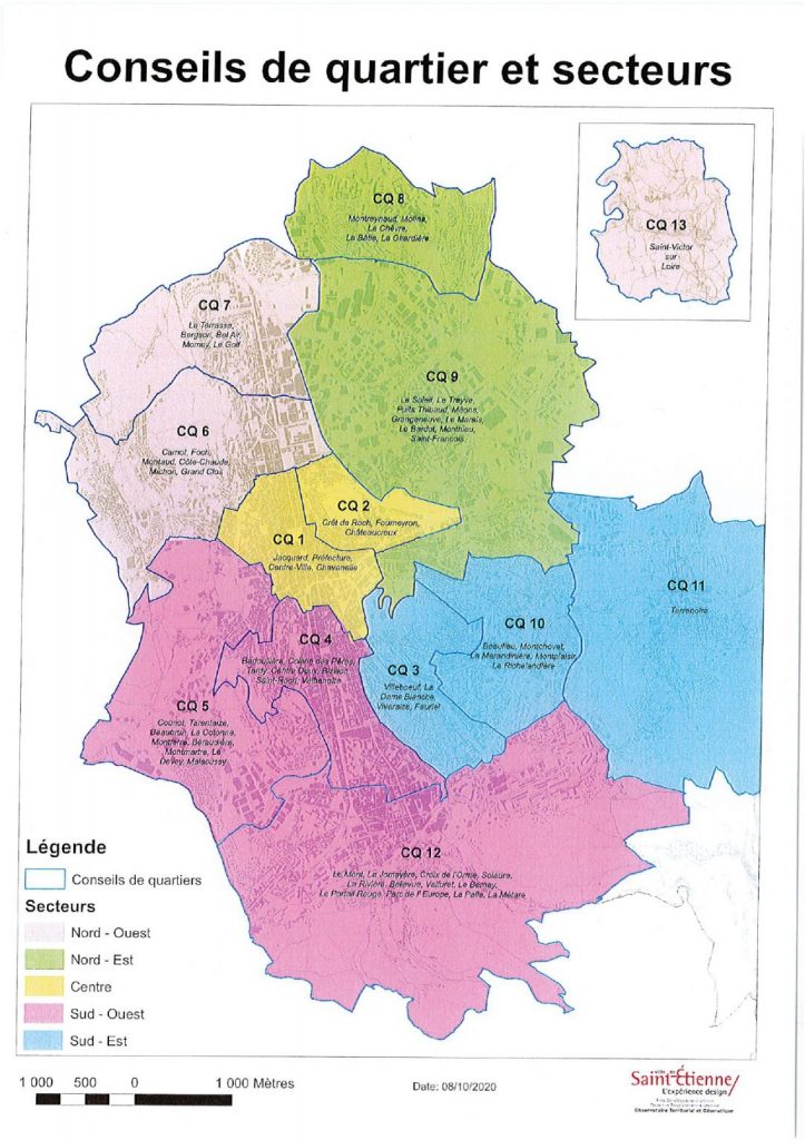 La Ville de Saint-Etienne dispose de 13 conseils de quartier répartis sur 5 secteurs. Ces périmètres ont été fixés par le conseil municipal dans sa séance du 16 novembre 2020.