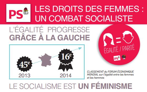 A l’occasion de la Journée internationale des droits des femmes, le Parti socialiste édite un petit document « Les Droits des Femmes, un combat socialiste ». Celui-ci présente la progression de l’égalité femmes-hommes dans notre pays depuis l’élection de François Hollande en 2012. La France est ainsi passée du 45ème au 16ème rang dans le classement du Forum économique mondial sur l’égalité entre les femmes et les hommes.