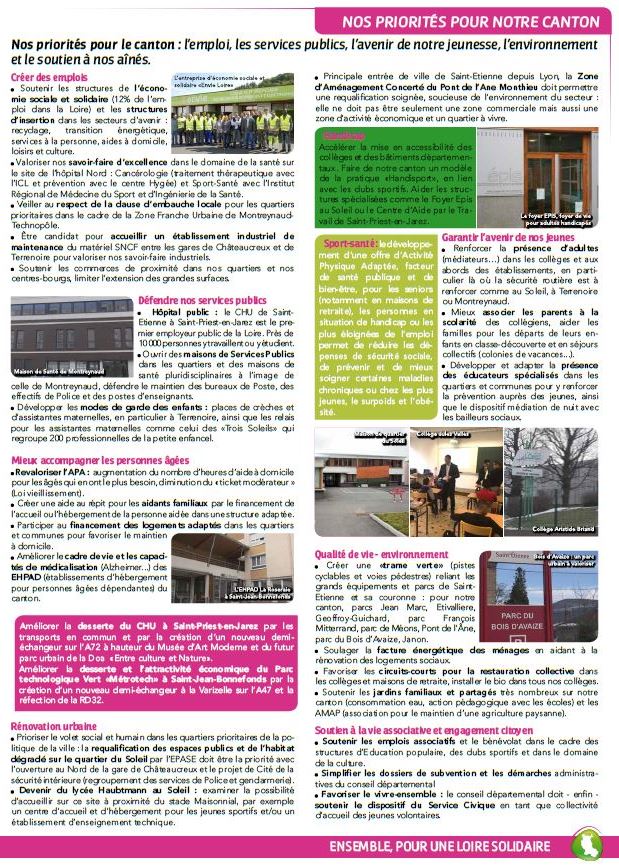 Dans l’esprit du «11 janvier» et de la mobilisation de nos concitoyens après les attentats, nous avons souhaité former une équipe soudée, rassemblée au-delà de nos étiquettes politiques respectives des formations de gauche et de progrès, sous la bannière «Ensemble pour une Loire solidaire». Une solidarité qui s’exerce dans nos vies quotidiennes à tous les âges de la vie, qui résume bien l’état d’esprit de nos projets pour la Loire et le canton présentés dans le document distribué dans toutes les boîtes aux lettres du canton.