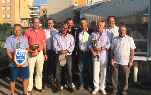 Célébrations du titre de Champions de France FSCF 3ème division de l’équipe Jouanny, Challard, Fournier, Dury, Geay au Cercle de Saint-Priest-en-Jarez