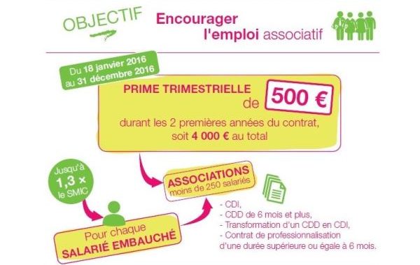 Les embauches réalisées par les associations, groupements d’employeurs ou les entreprises de moins de 250 salariés, bénéficient durant les 2 premières années du contrat d’une prime trimestrielle de 500 euros, soit 4 000 euros au total. Ces embauches doivent avoir été réalisées entre le 18 janvier et le 31 décembre 2016.