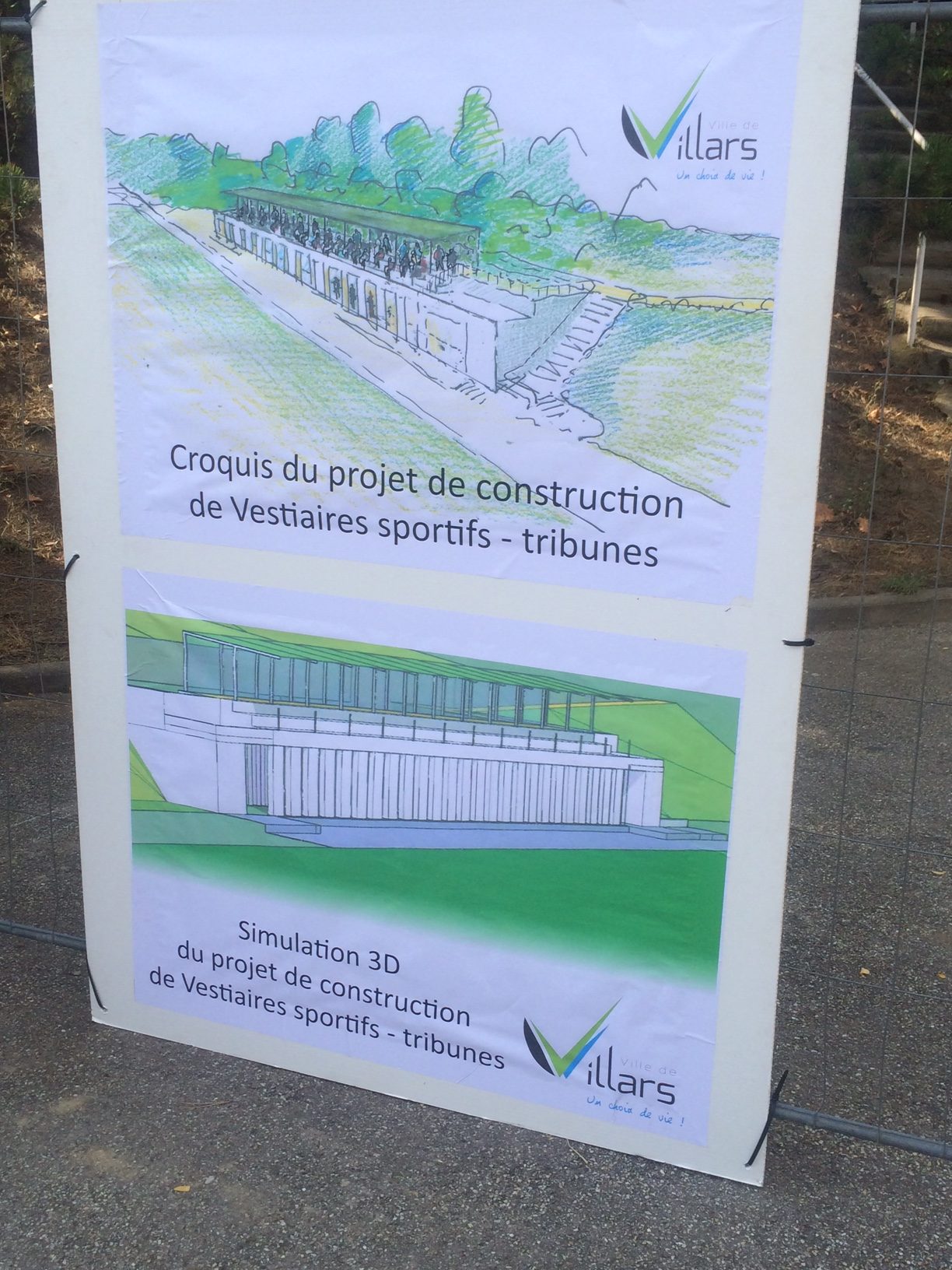 Un bâtiment neuf de près de 600m² va être construit à flanc de colline. Le terrain très pentu a incité à penser l’intégration paysagère sous la forme d’un bâtiment qui sera à moitié enterré et ne présentera en définitive qu’une seule façade. 8 vestiaires sont prévus (dont 4 vestiaires joueurs « entrainement » et 2 vestiaires « match »), 2 vestiaires arbitres, un local infirmerie et des locaux de stockage pour les associations villardaires.