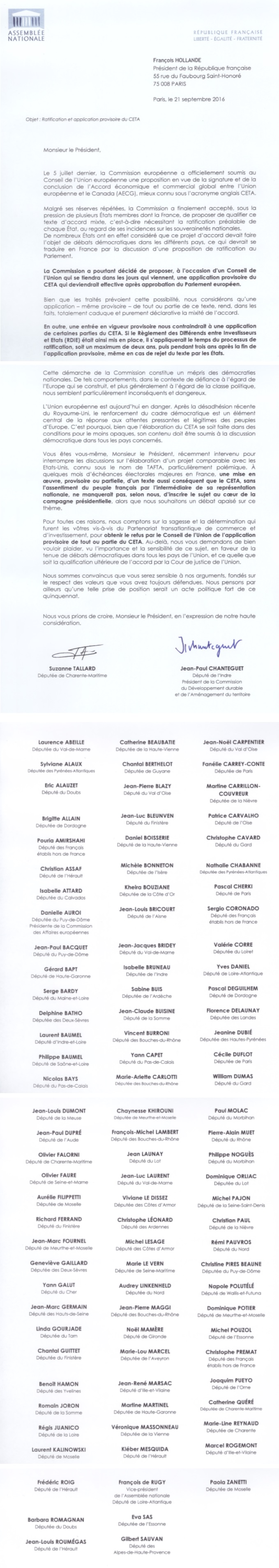 Contrairement au TAFTA, la Commission Européenne avait accepté le principe d’un triple contrôle de l’adoption du CETA : le Conseil des chefs d’Etat et de gouvernement, puis la majorité du Parlement européen, et enfin les parlements nationaux de tous les Etats membres devaient donner leur accord. L’application provisoire du CETA, même partielle, empêche ces contrôles démocratiques. C’est pourquoi j’ai signé ce courrier au Président de la République demandant l’abandon de l’application provisoire du CETA.
