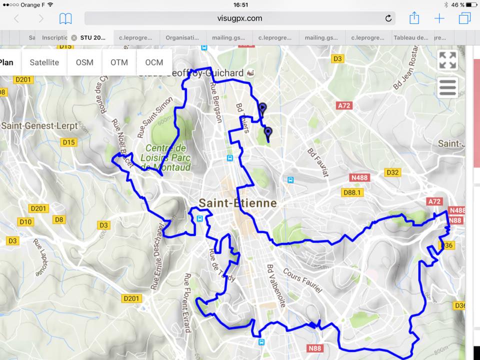stu2016-2 Passage au Crêt de Roc, Jardins des Plantes, Bois d’Avaize, à Janon, puis La Métare, La Cotonne, la Colline des Pères, le Puits Couriot, le Cimetière de Côte-Chaude, le Crêt des 6 Soleils à Montaud puis le stade Geoffroy Guichard sont quelques unes des principales difficultés de ce parcours avec des montées et des marches casse-pattes !