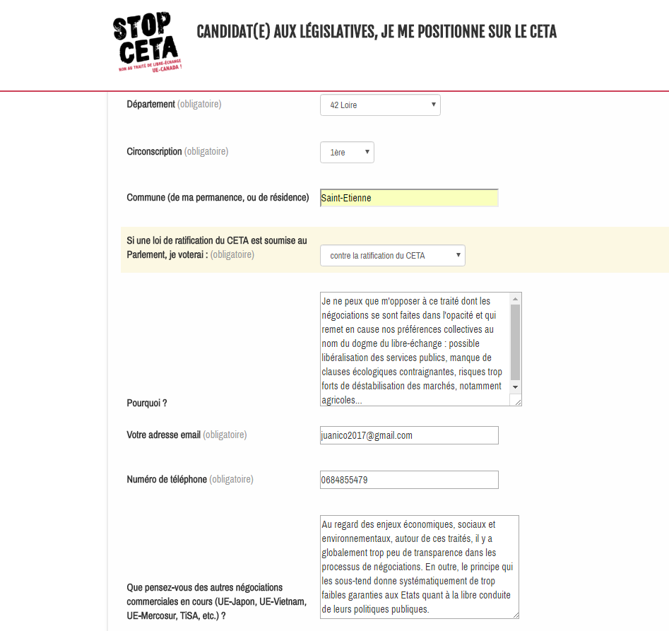 Afin de faciliter la mobilisation, pédagogie et la lisibilité sur l’avis des futurs députés, un document a été mis en place pour recueillir les intentions de positionnement des futurs députés au sujet du CETA. Vous trouverez ci-dessous mes réponses à ce court questionnaire.