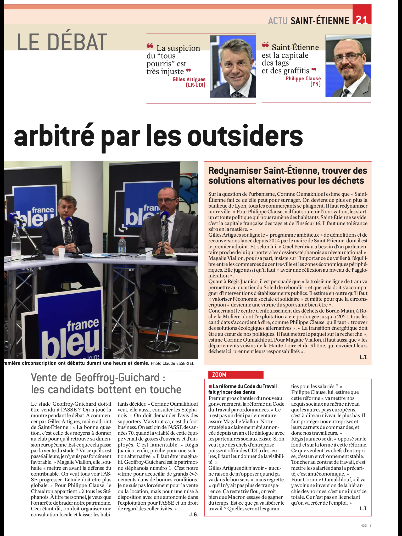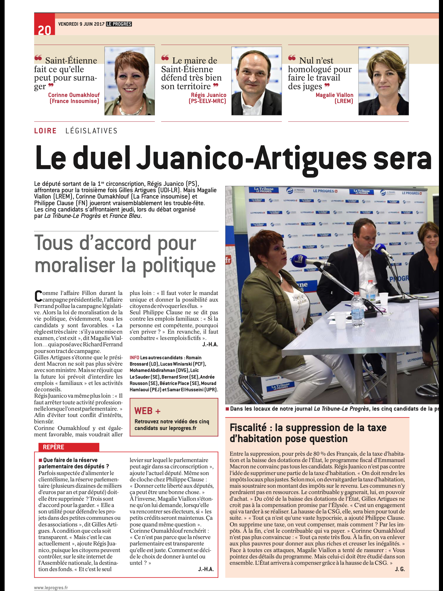 J’ai participé hier au débat organisé par France Bleu, Le Progrès avant le 1er tour des législatives dans la 1ère circonscription de la Loire avec 4 autres candidats : Gilles Artigues (LR-UDI), Corinne Oumakhlouf (FI), Philippe Clause (FN), Magalie Viallon (LREM).