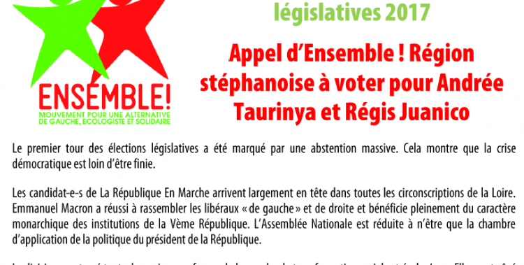 Dans ce contexte, Ensemble ! Région stéphanoise se félicite de la qualification au second tour de candidat-e-s de gauche dans les 1ère et 2ème circonscriptions. Nous appelons à la mobilisation la plus forte pour faire élire Régis Juanico (Parti socialiste, « frondeur » hamoniste) et Andrée Taurinya (France insoumise).