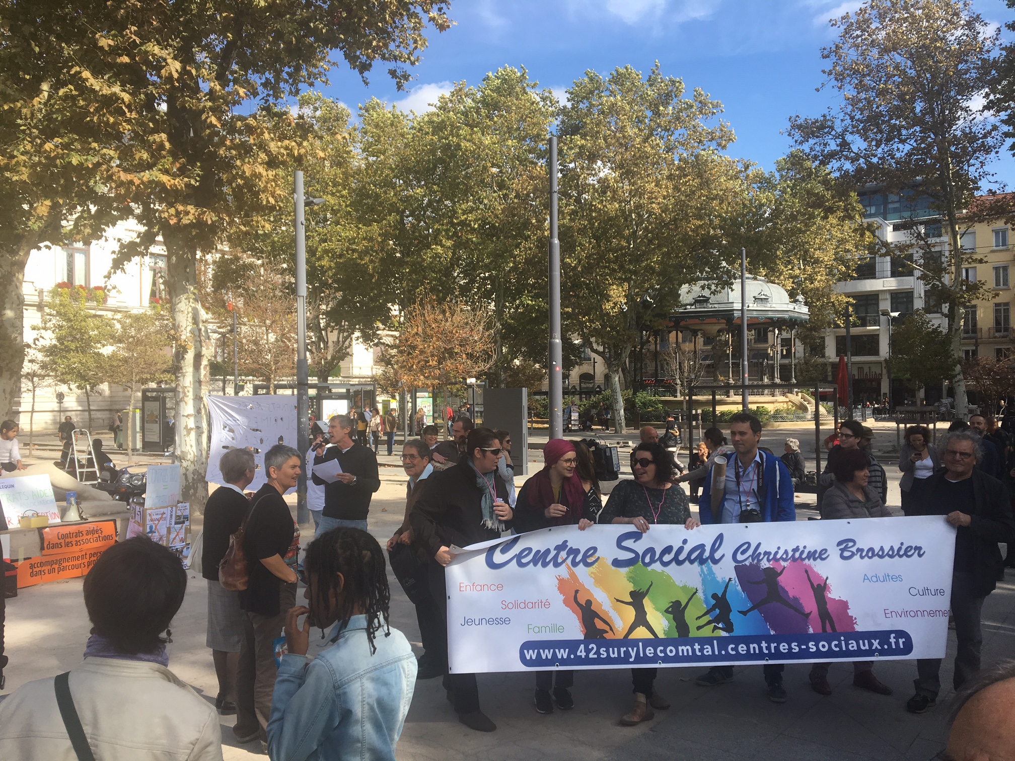 de Jeunesse et d’Education Populaire de la Loire et les associations affiliées (centres sociaux, MJC, amicales laïques, maisons de quartier…) ont organisé une journée d’action, festive et revendicative, ce mercredi 18 octobre 2017 pour protester contre la suppressions des contrats aidés.