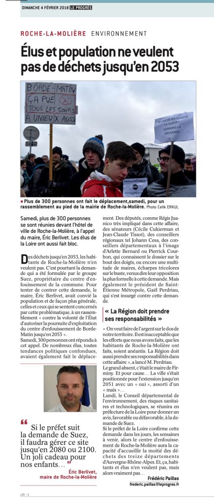 Nous saluons la prise de conscience salutaire, bien que tardive, des représentants du Département de la Loire, des Maires de la Loire et de Saint-Etienne Métropole, quant aux conséquences envisageables de la suite favorable qui devrait selon toute vraisemblance être donnée aux demandes de l’exploitant SUEZ.