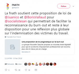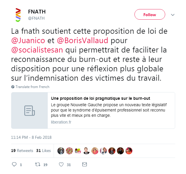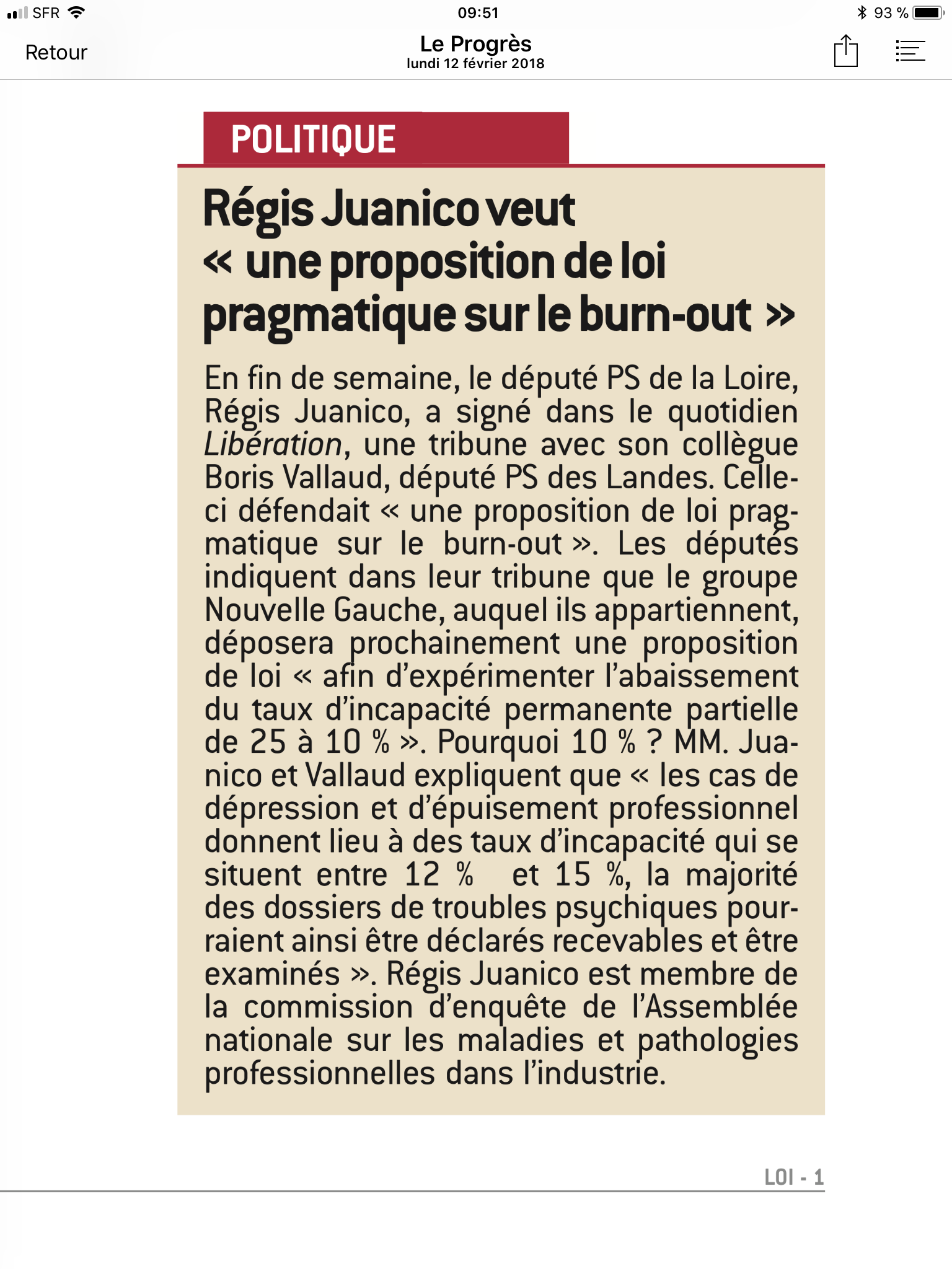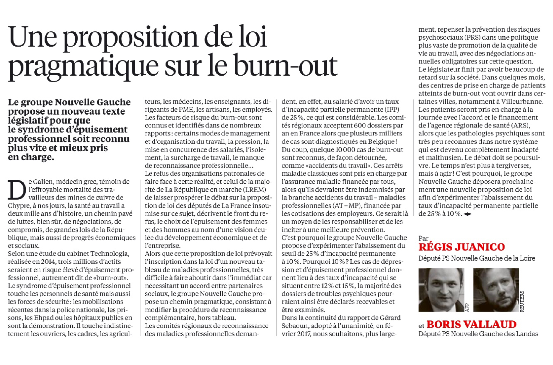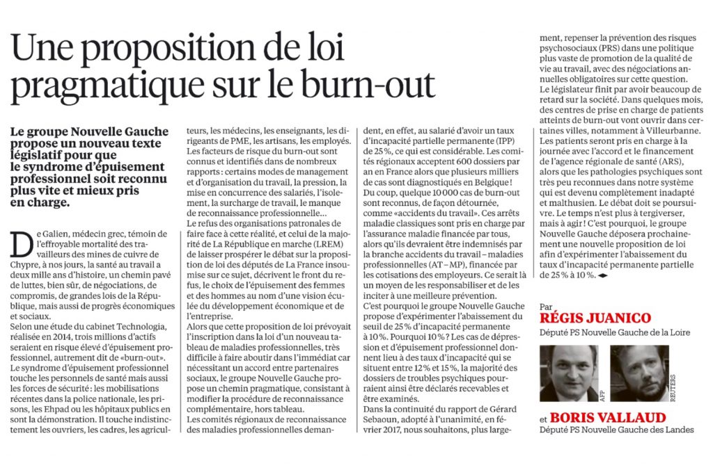 J’ai publié une tribune, ce vendredi 9 février, dans le quotidien Libération pour une meilleure reconnaissance du syndrome d’épuisement professionnel, dit burn-out, co-signée avec mon collègue Boris Vallaud. J’y annonce que nous déposerons, avec le groupe Nouvelle Gauche, une proposition de loi dans ce sens, dans les prochaines semaines, qui permettra une avancée pragmatique.