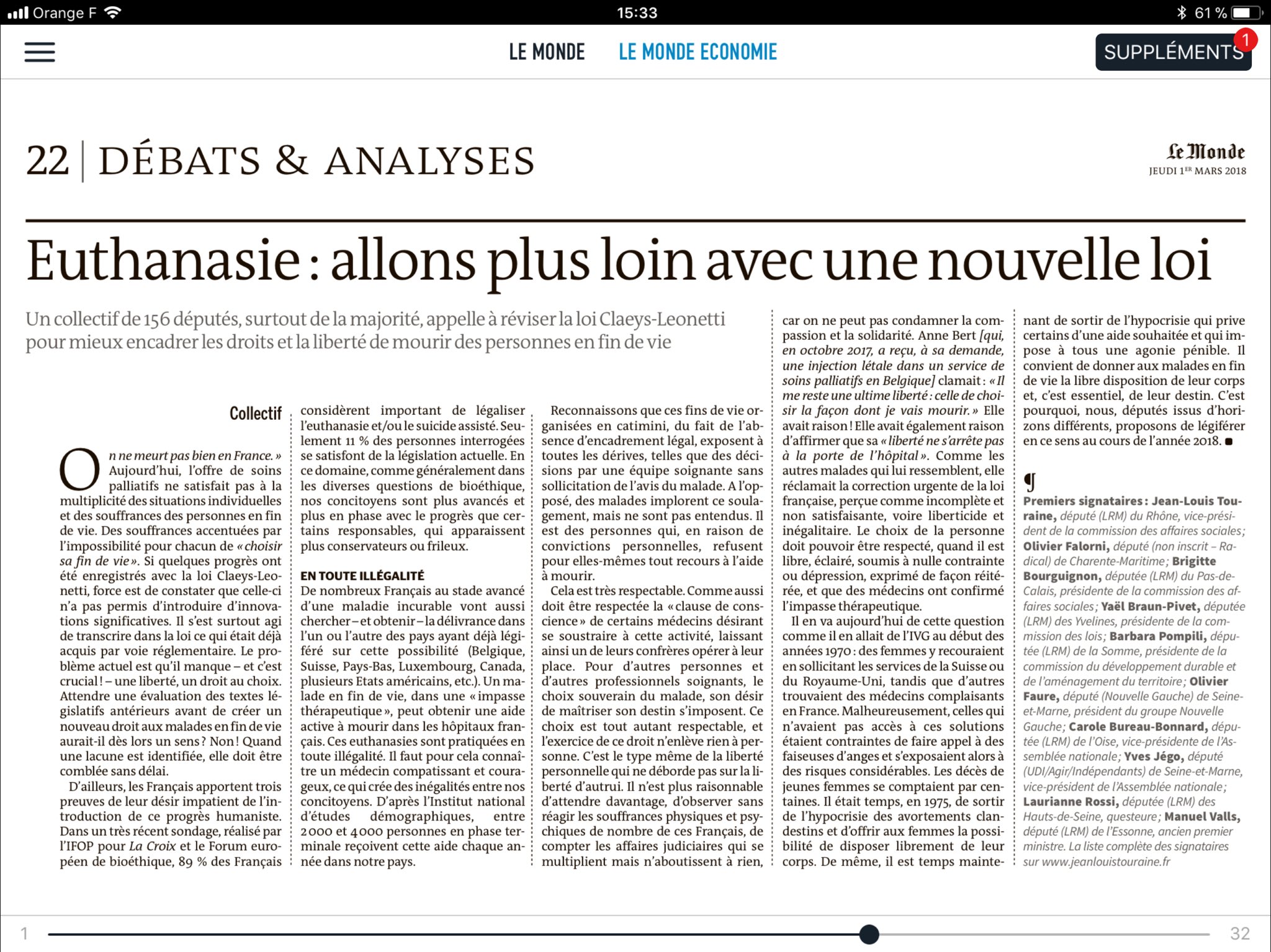 De même, il est temps maintenant de sortir de l’hypocrisie qui prive certains d’une aide souhaitée et qui impose à tous une agonie pénible. Il convient de donner aux malades en fin de vie la libre disposition de leur corps et, c’est essentiel, de leur destin.