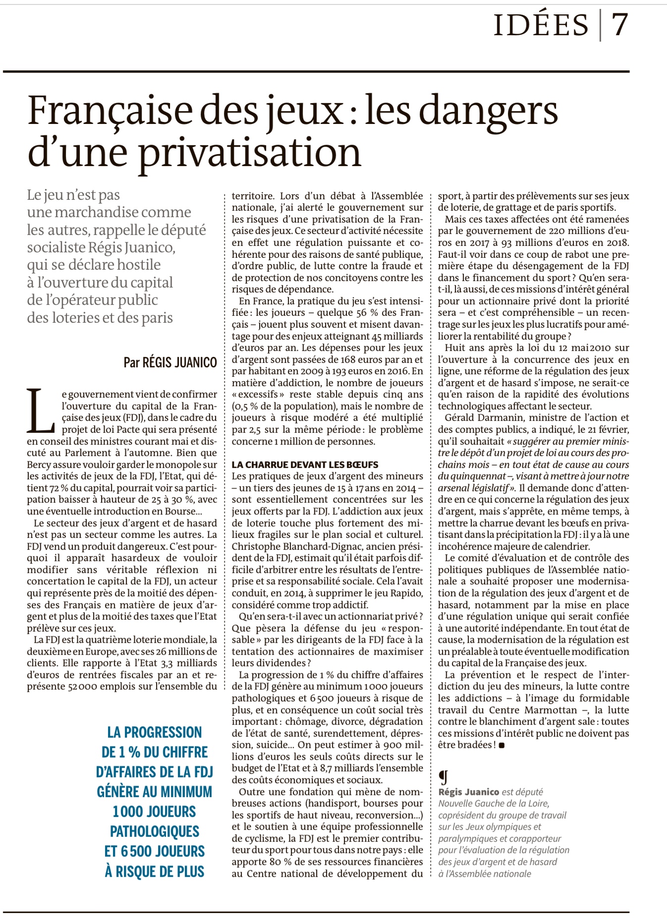Confirmée récemment par le Gouvernement, la future privatisation de la Française des Jeux (FDJ) n’est pas sans risque selon le député socialiste de la Loire Régis Juanico, qui a publié une tribune dans Le Monde sur le sujet.