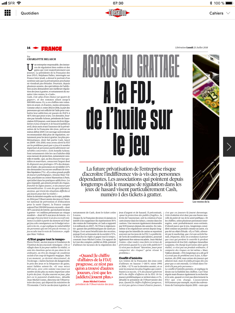 Ce mardi 10 avril paraît dans Le Monde (voir plus bas), ma tribune sur les dangers de la privatisation de la Française des Jeux (FdJ). Elle fait suite à mon interpellation du ministre de l’économie et des finances Bruno Le Maire (voir ci-après), lors d’une séance de questions sur le programme de privatisations du gouvernement, le 4 avril dernier.