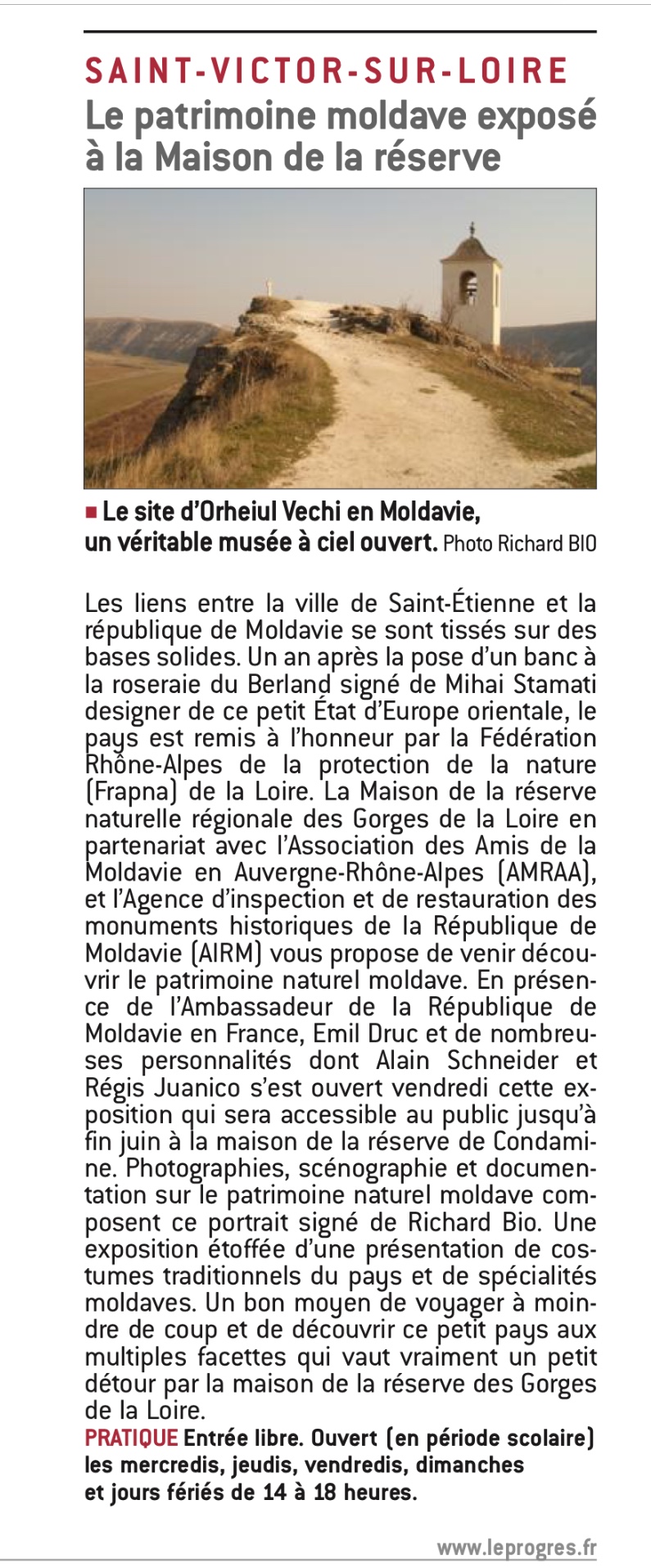 La Maison de la Réserve Naturelle Régionale des gorges de la Loire propose actuellement une nouvelle exposition consacrée au patrimoine naturel moldave, en partenariat avec l’Association des Amis de la Moldavie en Auvergne-Rhône-Alpes (AMRAA), et l’Agence d’Inspection et de Restauration des Monuments Historiques de la République de Moldavie (AIRM).