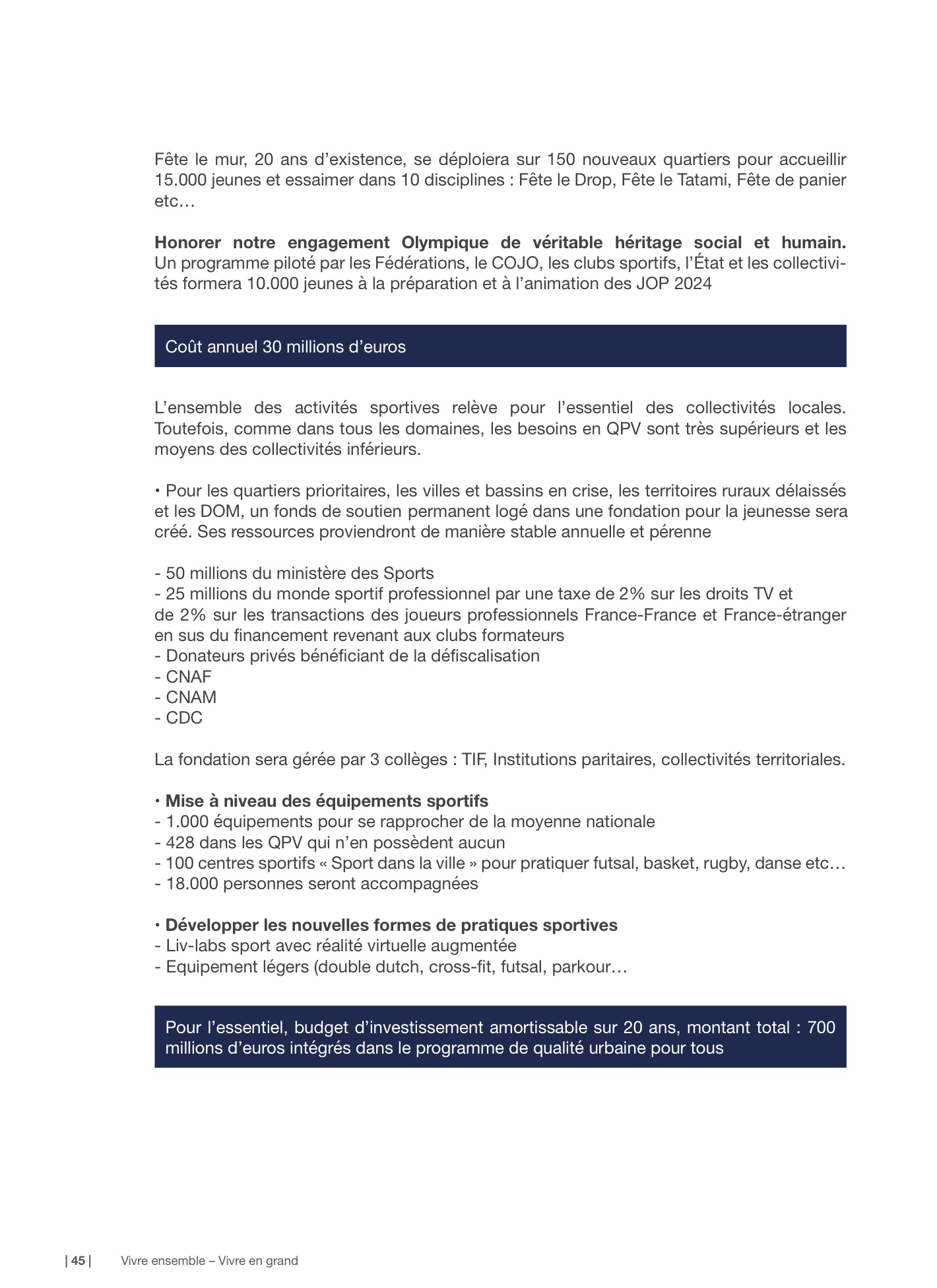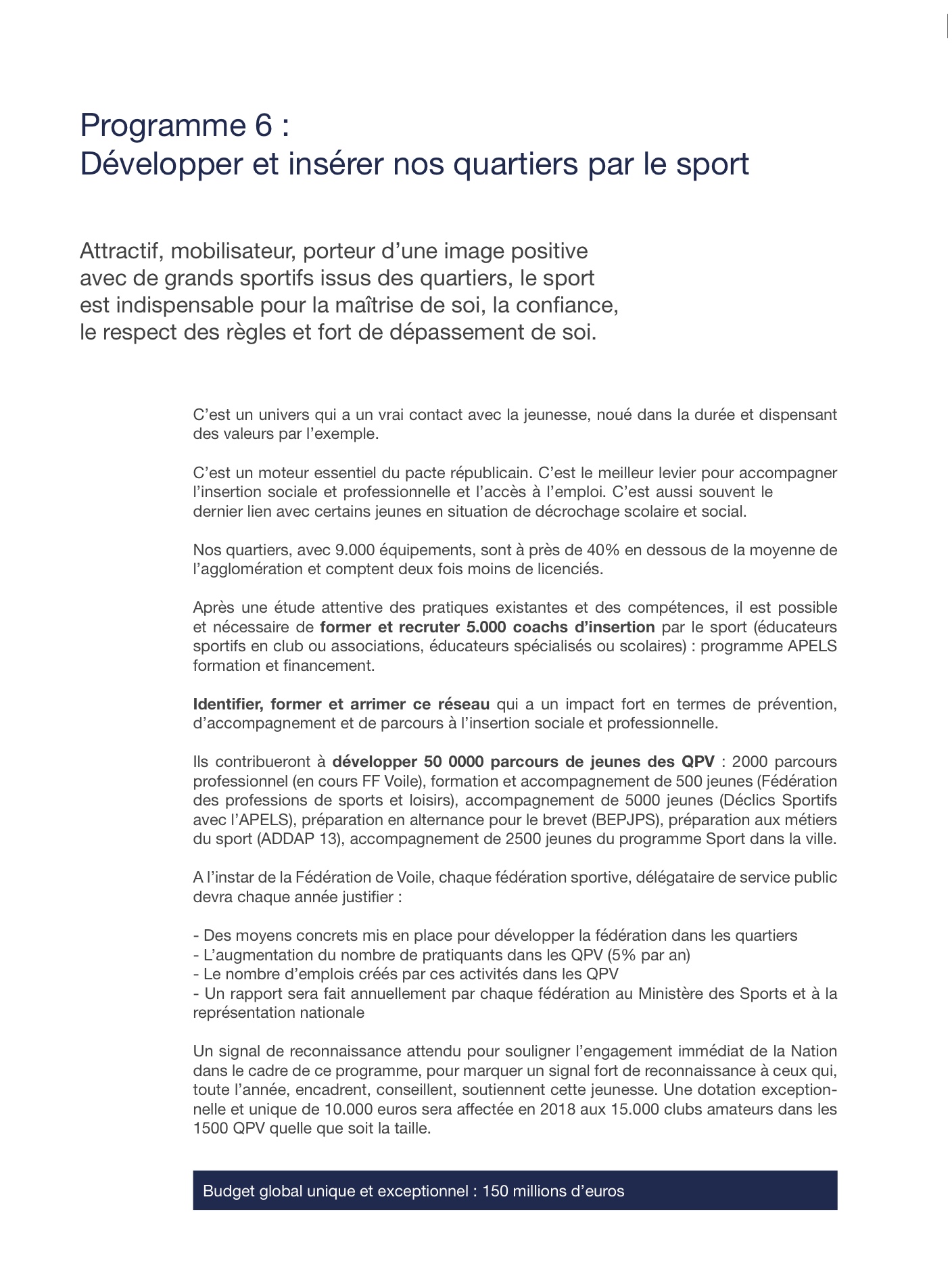 Pour mémoire, les propositions du rapport Borloo sur un sujet qui m’est cher : développer et insérer par le sport dans nos quartiers.