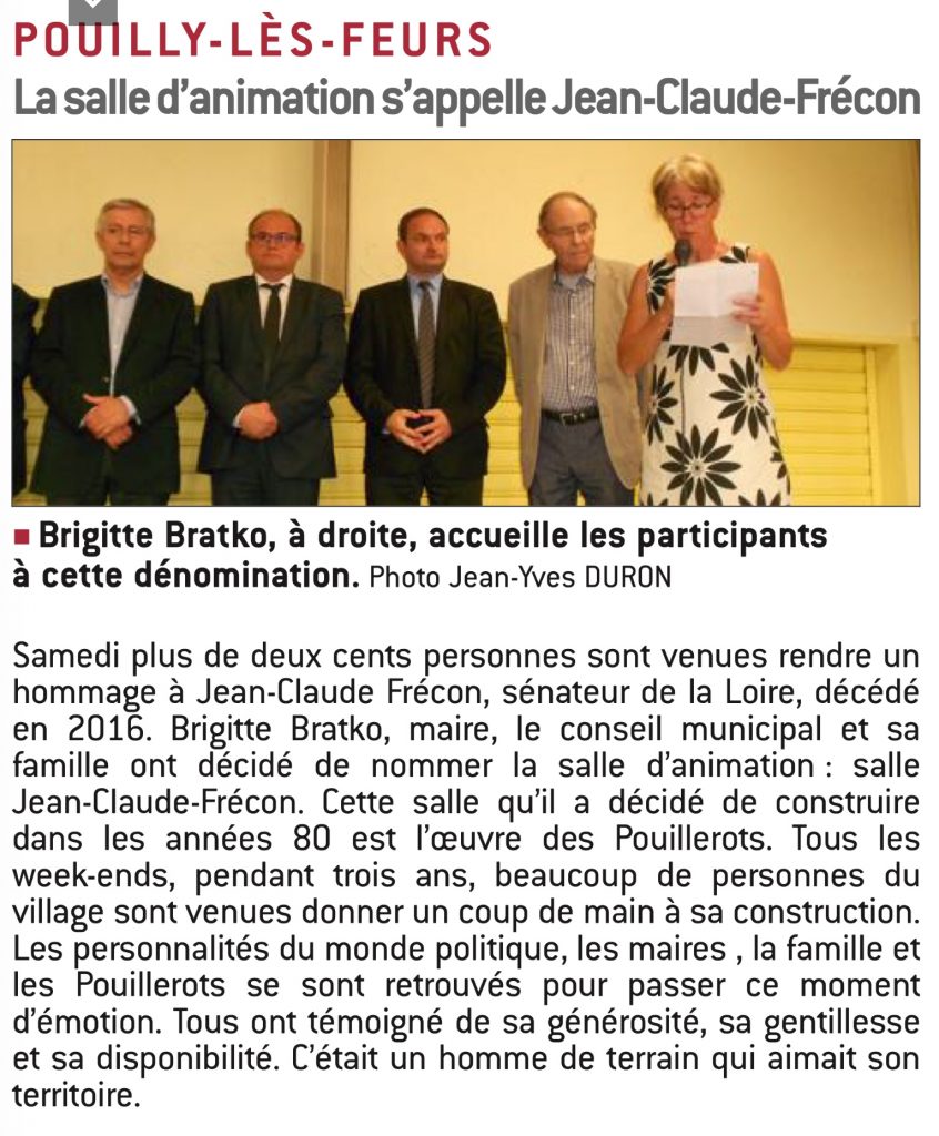 A travers l’inauguration de la salle des fêtes communale à la mémoire de Jean-Claude FRÉCON à Pouilly-les-Feurs, un hommage lui a été rendu.