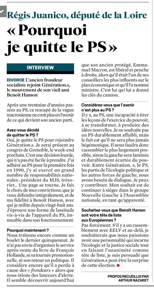 La lettre A, un support politique spécialisé, l’avait annoncé, il y a plusieurs mois, Régis Juanico quitte le PS pour rejoindre le parti Génération S de son ami Benoit Hamon. Il s’en explique longuement dans les colonnes du Journal du Dimanche… Lire la suite…