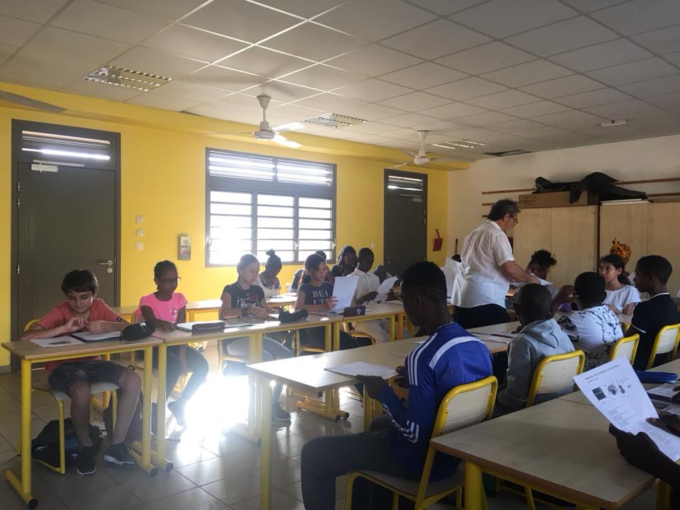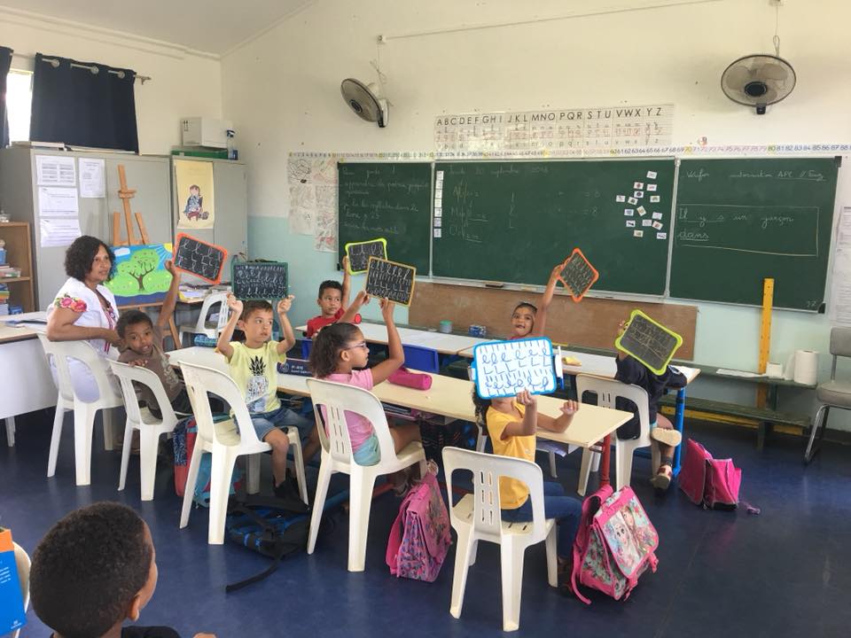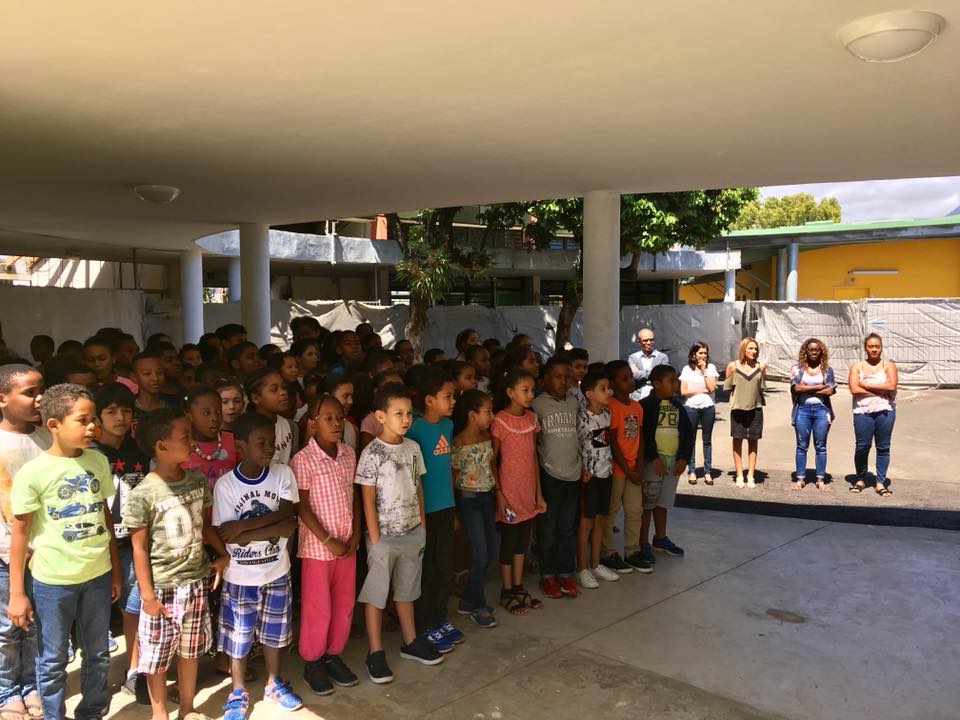 Nous avons été accueillis en chanson par les élèves de l’école Edmond Allard dans le quartier politique de la ville de la Cressonnière à Saint-André après un passage à l’école Edmond Albius dans les « hauts » de Cambourg sur la commune de Saint-Benoît. Nous avons assisté à plusieurs séquences pédagogiques en classe d’apprentissage de lecture, d’écriture et d’expression avec des CP et CE1 dédoublés.