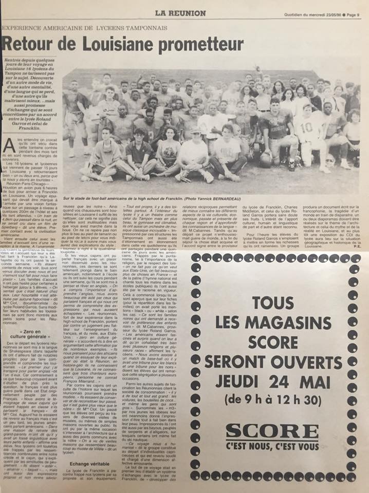 J’en ai profité pour verser aux archives du lycée un article du Quotidien de la Réunion daté du 23 mai 1990 relatant notre retrait d’un séjour en Louisiane dans le cadre d’un jumelage avec le lycée de Franklin près de Lafayette.