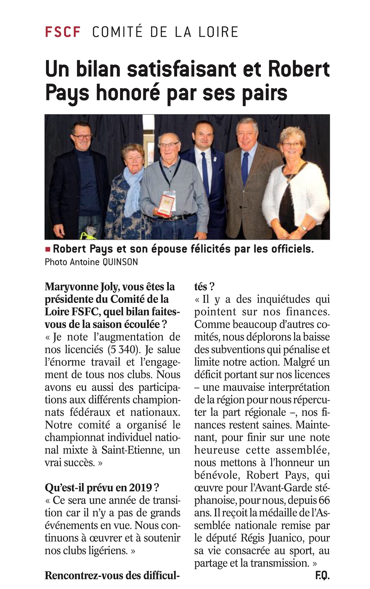 A l’occasion de l’Assemblée générale du Comité départemental de la FSCF, et après être revenu sur l’actualité nationale -pour le moins maussade, concernant le budget des sports, j’ai eu le plaisir de mettre à l’honneur un grand bénévole du mouvement sportif stéphanois : Robert Pays.