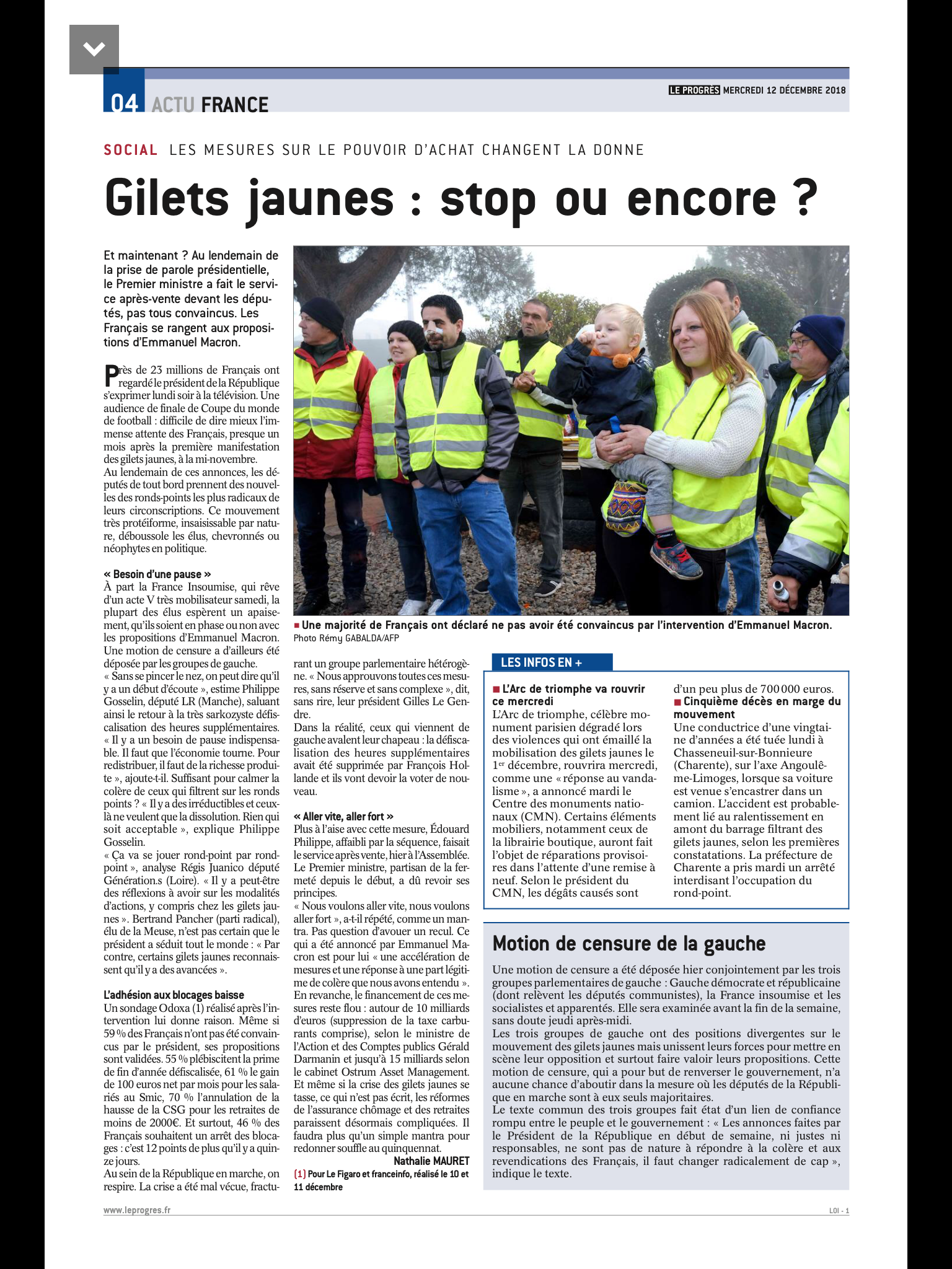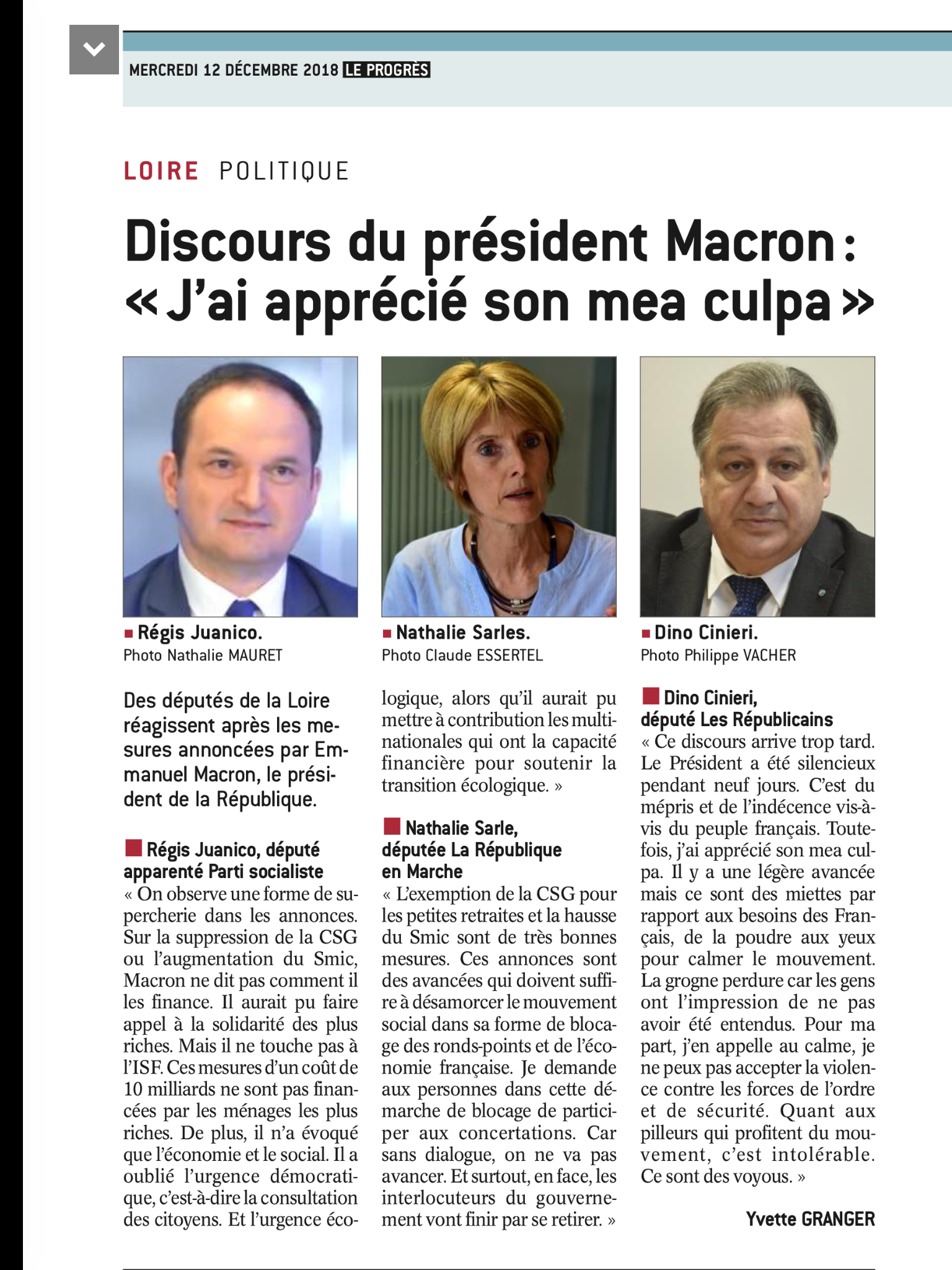 Le Président ne sort toujours pas des dogmes dans lesquels il est enferré. Ce sont encore et toujours les mêmes, les Français des classes populaires et moyennes qui vont être mis à contribution pour financer les mesures annoncées (pour un coût estimé à 10 milliards d’euros), pas les grandes fortunes ni les entreprises les plus profitables qui sont exemptées de toutes contributions financières à l’effort de solidarité nationale. Sans remise en cause des cadeaux fiscaux aux ménages les plus riches (ISF, prélèvement forfaitaire unique…), il est à craindre que de nouveaux coups de rabots seront portés au budget 2019 avec des réductions supplémentaires des dépenses publiques : moins de fonctionnaires, moins de services publics sur les territoires.