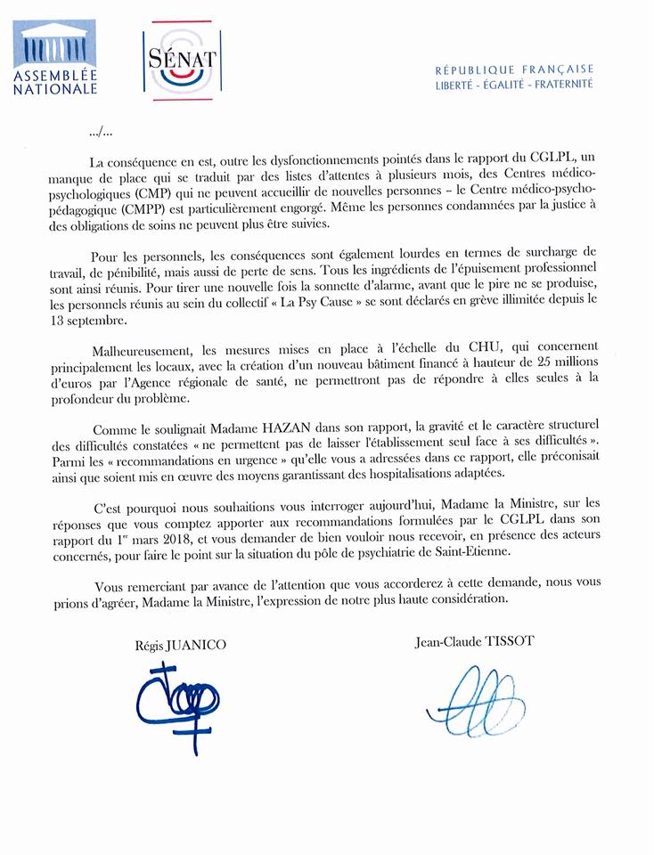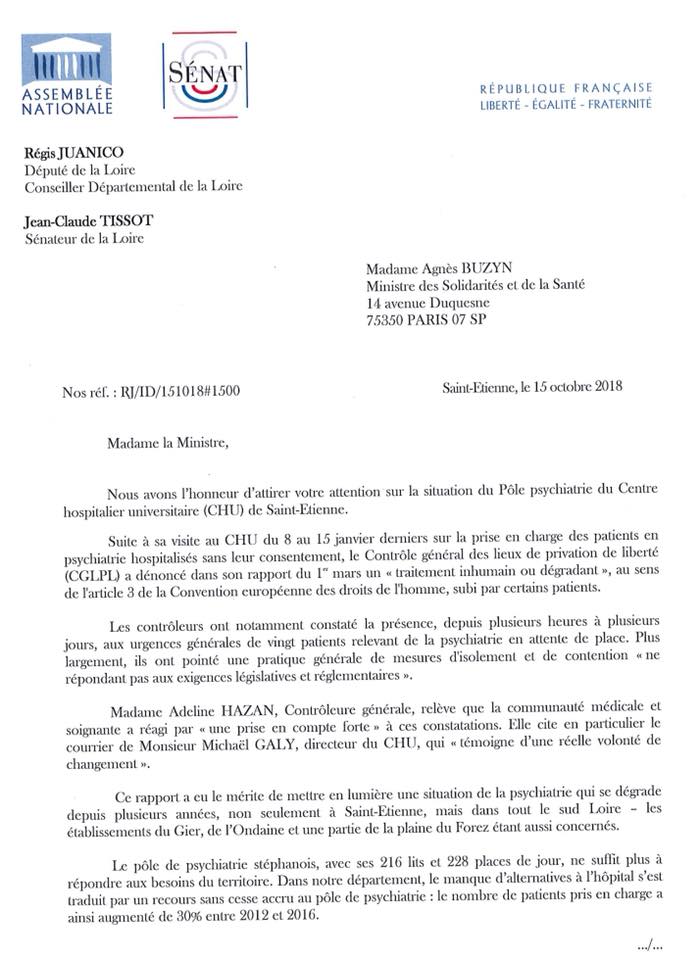 Le mardi 27 novembre 2018, après avoir reçu avec Jean-Claude Tissot, Sénateur de la Loire, les personnels en grève à plusieurs reprises, j’ai interpellé à l’Assemblée nationale, la Ministre de la santé, Agnès Buzyn et le gouvernement sur le manque de moyens financiers et humains au sein du service de psychiatrie du CHU de Saint-Etienne. h