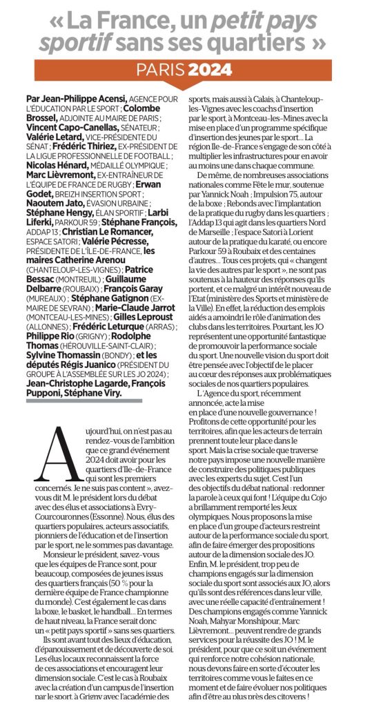 Dans une tribune au Parisien – Aujourd’hui en France, j’ai plaidé, avec de nombreux sportifs, ex-sportifs, élus, pour des Jeux olympiques qui prendront en compte les quartiers et apporteront une réponse aux problématiques sociales.