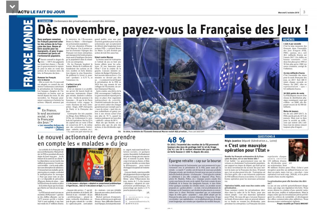 Je suis intervenu, jeudi 14 mars, en séance publique sur l’examen du projet de loi PACTE, pour dénoncer la privatisation de la Française des Jeux, qui représente une aubaine pour le futur investisseur privé… au détriment des comptes publics.