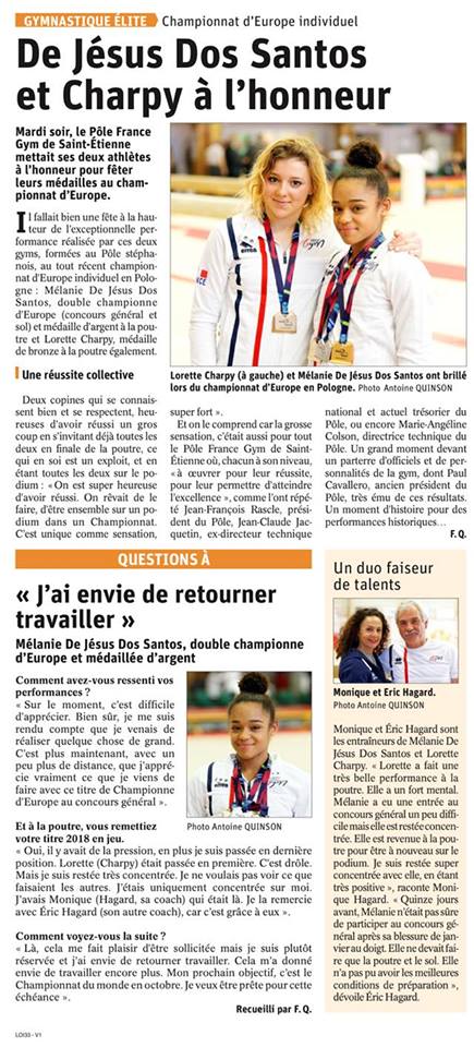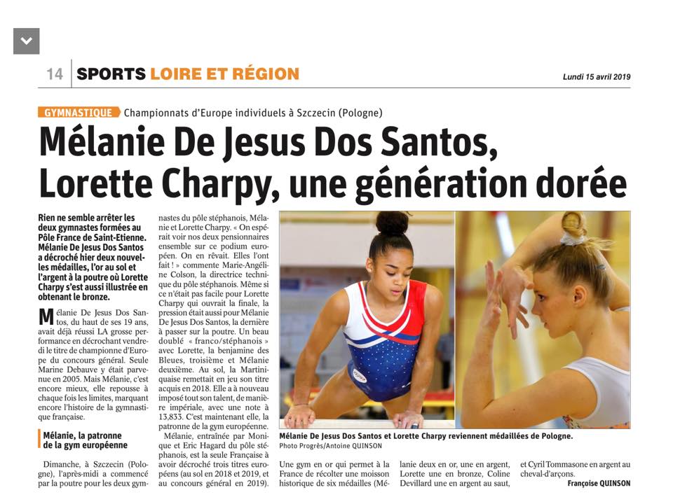 Samedi 13 avril, le Pôle France de Gymnastique de Saint-Etienne a accueilli ses héroïnes. Mélanie De Jesus Dos Santos et Lorette Charpy, de retour de Pologne, lestées de quatre médailles européennes autour du cou. Elles ont été à longuement applaudies par le public présent et tour à tour saluées pour leur performance historique par le président du Pôle France, Jean-Francois Rascle, leur copine d’entraînement très émue lors de sa prise de parole, Juliette Bossu, les élus partenaires, les entraîneurs -comblés- Eric et Monique Hagard et la directrice sportive Marie-Angeline Colson qui a rappelé le travail d’équipe initié il y a 35 ans par les fondateurs et remercié tous ceux qui travaillent au quotidien au sein du pôle pour obtenir ces résultats sportifs remarquables.