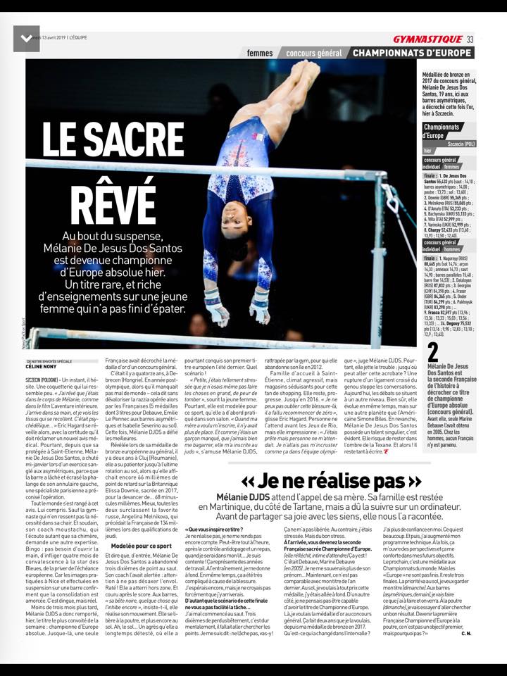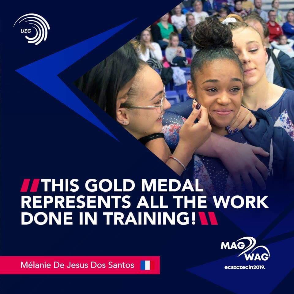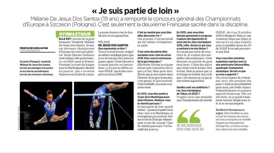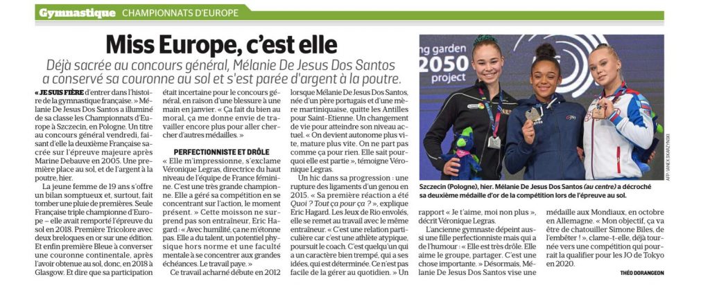 Ce que vient de réaliser Mélanie De Jesus Dos Santos est historique, une performance exceptionnelle au plus haut niveau mondial. À 19 ans, la gymnaste du pôle France de Saint-Etienne, obtient deux médailles d’or (concours général et sol) et une d’argent (poutre) aux championnats d’Europe de Szcecin en Pologne. L’an dernier, elle avait été déjà sacrée au sol à Glasgow.