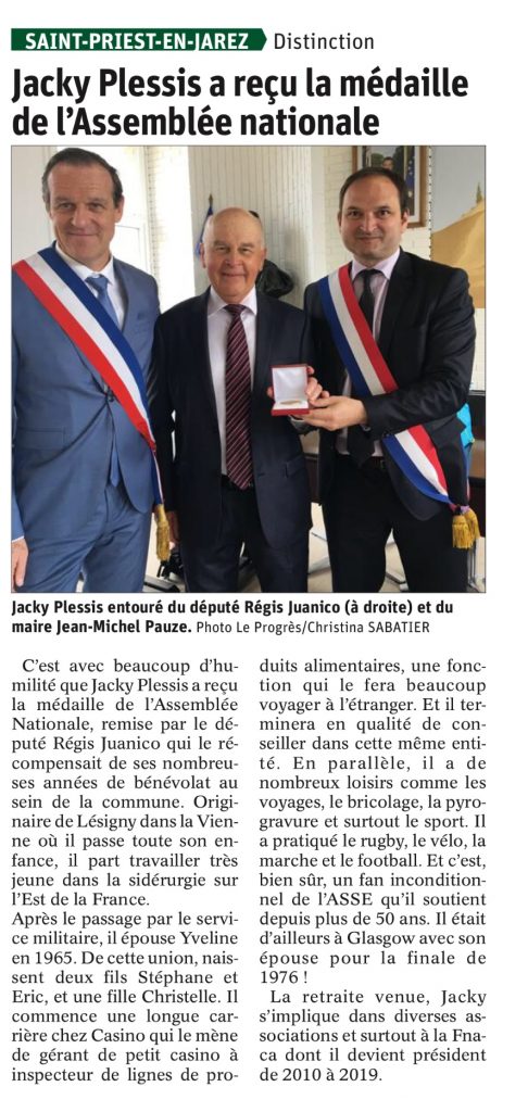 A l’occasion de la cérémonie commémorative du 8 mai 1945 à Saint-Priest-en-Jarez, j’ai souhaité, aux côtés de Jean-Michel Pauze, maire de la commune, mettre à l’honneur le Président du comité local de la FNACA, Jacky Plessis, qui a annoncé son retrait de ses fonctions.