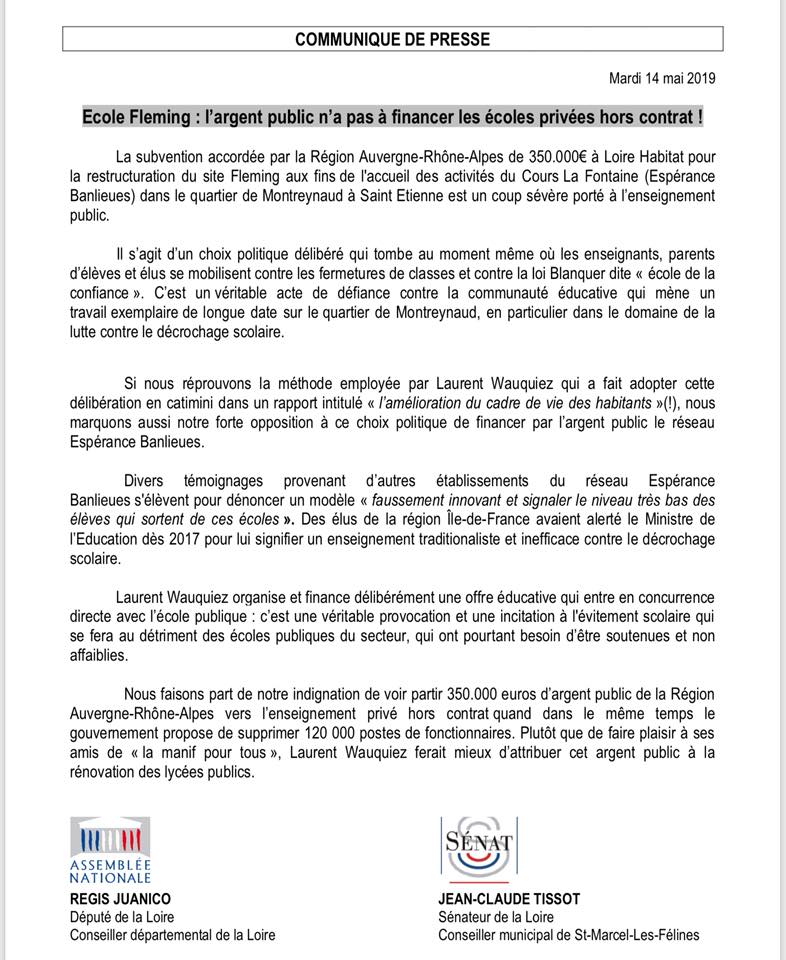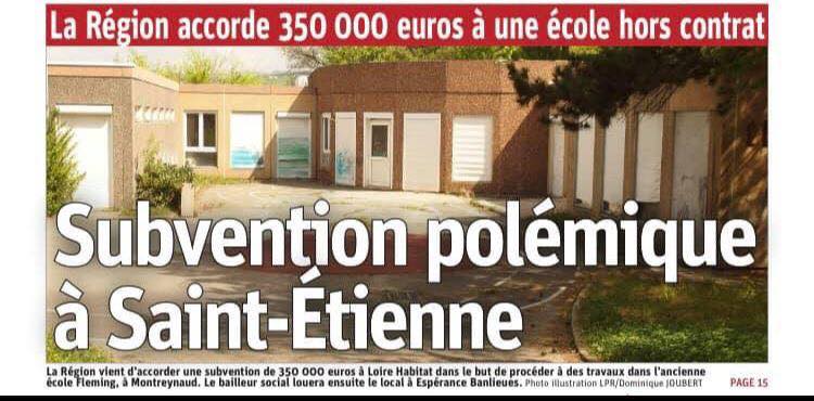 La subvention accordée par la Région Auvergne-Rhône-Alpes de 350.000€ à Loire Habitat pour la restructuration du site Fleming aux fins de l’accueil des activités du Cours La Fontaine (Espérance Banlieues) dans le quartier de Montreynaud à Saint Etienne est un coup sévère porté à l’enseignement public.