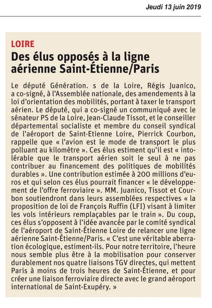 Au plan local, la proposition du nouveau Président du syndicat mixte de l’aéroport de Saint-Etienne / Loire, Gaël Perdriau, issue des conclusions du cabinet Abington, de relancer une ligne Saint-Etienne / Paris sous Obligation de Service Public (OSP), apparaît donc comme une véritable aberration écologique. Pour notre territoire, l’heure nous semble plus être à la mobilisation pour conserver durablement nos 4 liaisons TGV directes, qui mettent Paris à moins de 3 heures de Saint-Etienne, et pour créer une liaison ferroviaire directe avec le grand aéroport international de Saint-Exupéry, que de se battre pour développer ce mode de transport polluant, peu accessible, et pas même économe en temps de trajet.