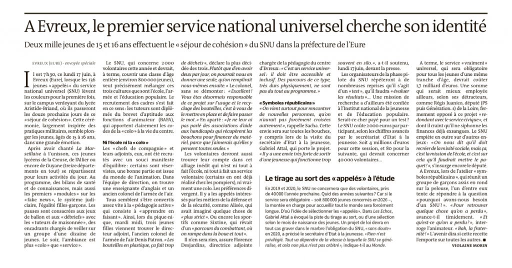 En ce qui concerne à présent le SNU, qui est plus que jamais d’actualité, son expérimentation commençant aujourd’hui.