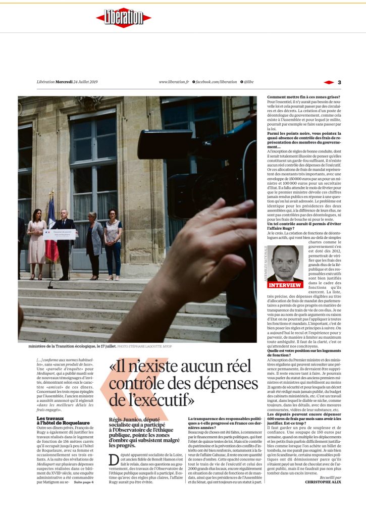 J’ai également été interviewé, ce mercredi 24 juillet, par le quotidien Libération, au sujet du manque de transparence dans les dépenses de l’exécutif, en marge de « l’affaire De Rugy ». Voici le détail de cet entretien :