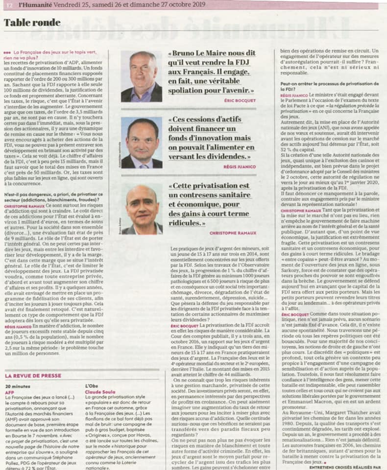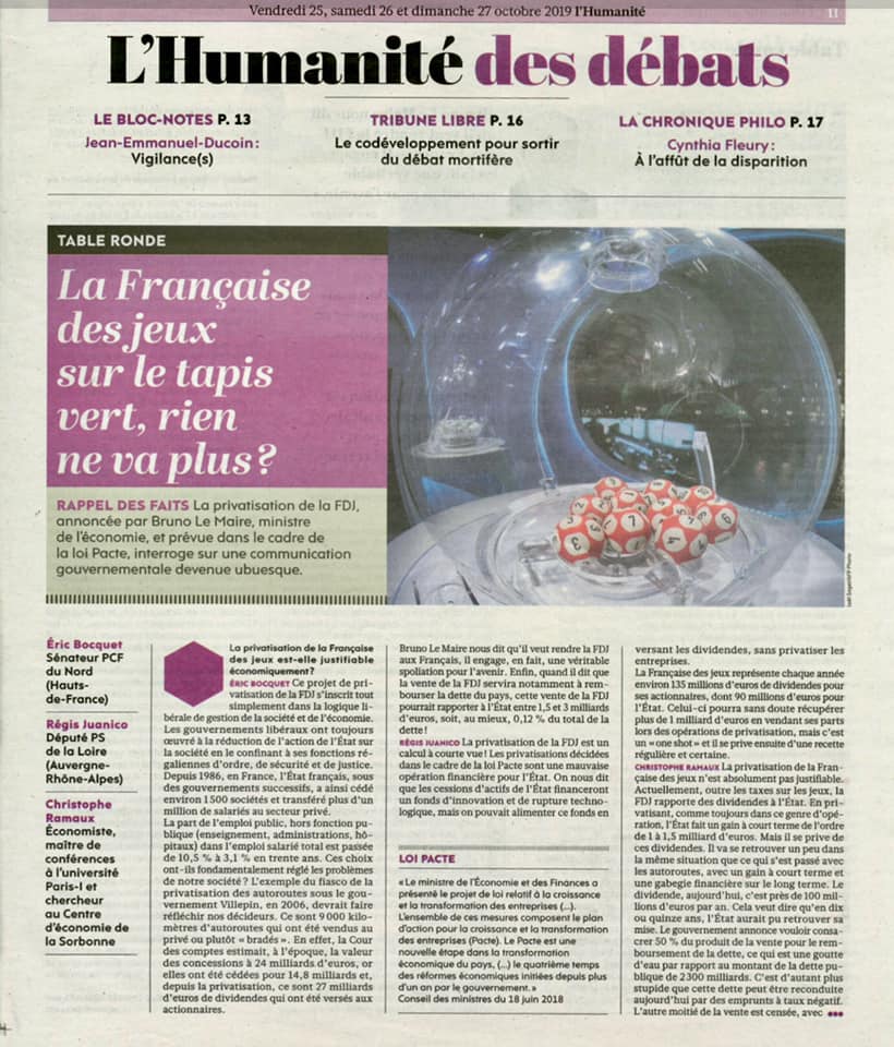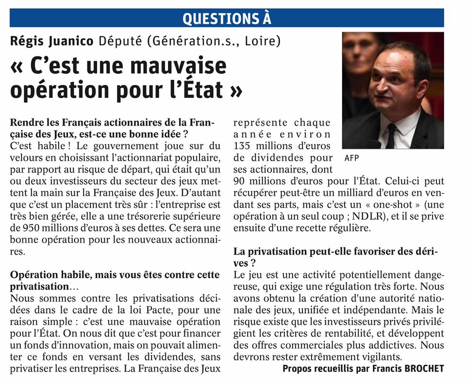 Dans un entretien dans le Progrès et les journaux du groupe Ebra, avec Francis Brochet, j’avais pu réagir sur la privatisation de la Française des Jeux rendue possible par l’approbation de la loi PACTE.
