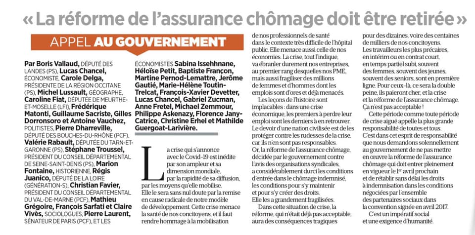 Nous avons rédigé, avec plusieurs élus et spécialistes, une Tribune collective parue dans Le Parisien-Aujourd’hui en France, pour que la réforme programmée du chômage soit retirée dans le contexte de crise sanitaire majeure que nous traversons.