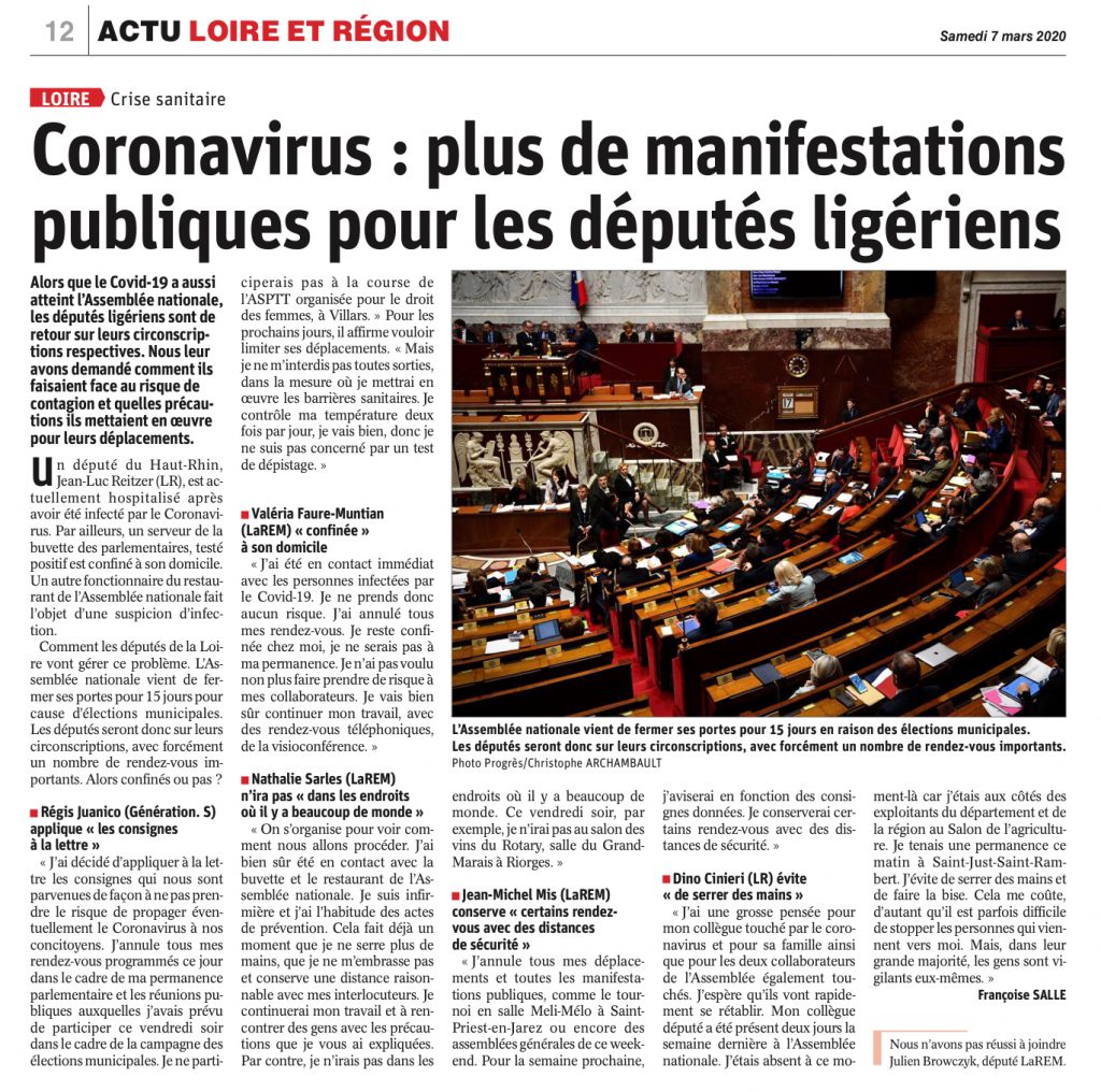 C’est pourquoi, ayant été présent de mardi matin à jeudi soir à l’Assemblée Nationale et même si je n’ai pas siégé à la commission des affaires culturelles la semaine dernière, pour cause de débat sur les retraites en séance publique et sans avoir eu de contact prolongé avec mes collègues dépistés, j’ai quand même décidé d’appliquer dès mon retour à Saint-Etienne le jeudi 5 mars les consignes de façon à ne pas prendre le risque de propager éventuellement le Coronavirus à nos concitoyens :