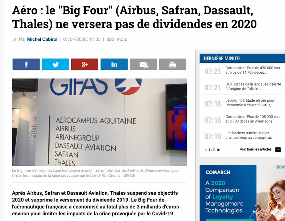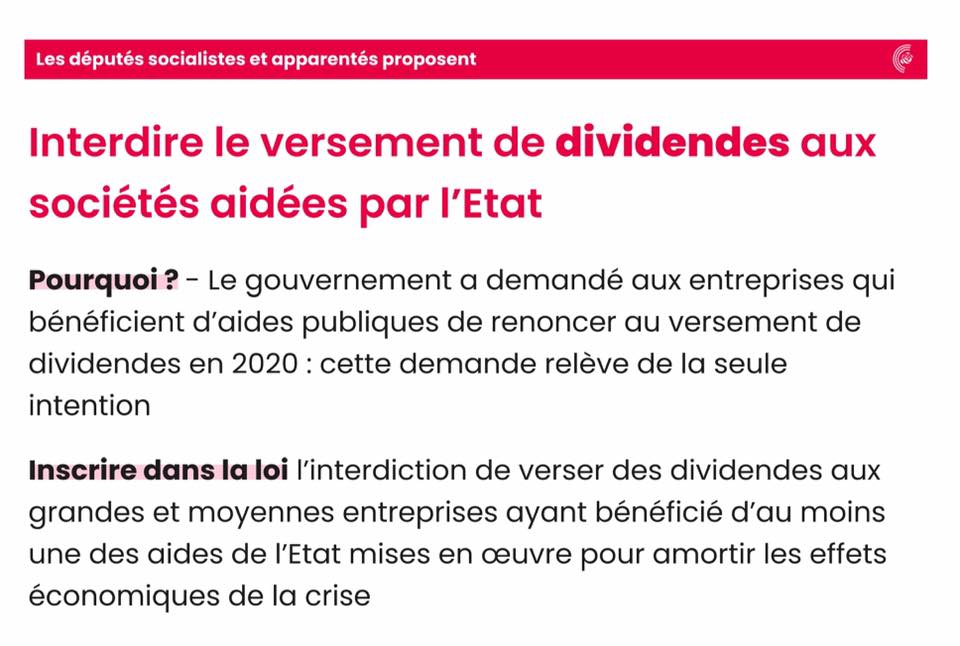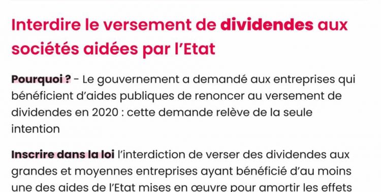 Au regard de la gravité de la situation économique et de la mobilisation massive de la puissance publique, le Ministre de l’Economie et des Finances a demandé aux entreprises qui bénéficient d’aides publiques (garantie, chômage partiel, fonds d’indemnisation, …) de renoncer au versement de dividendes en 2020. A ce stade, cette demande relève de la seule intention.