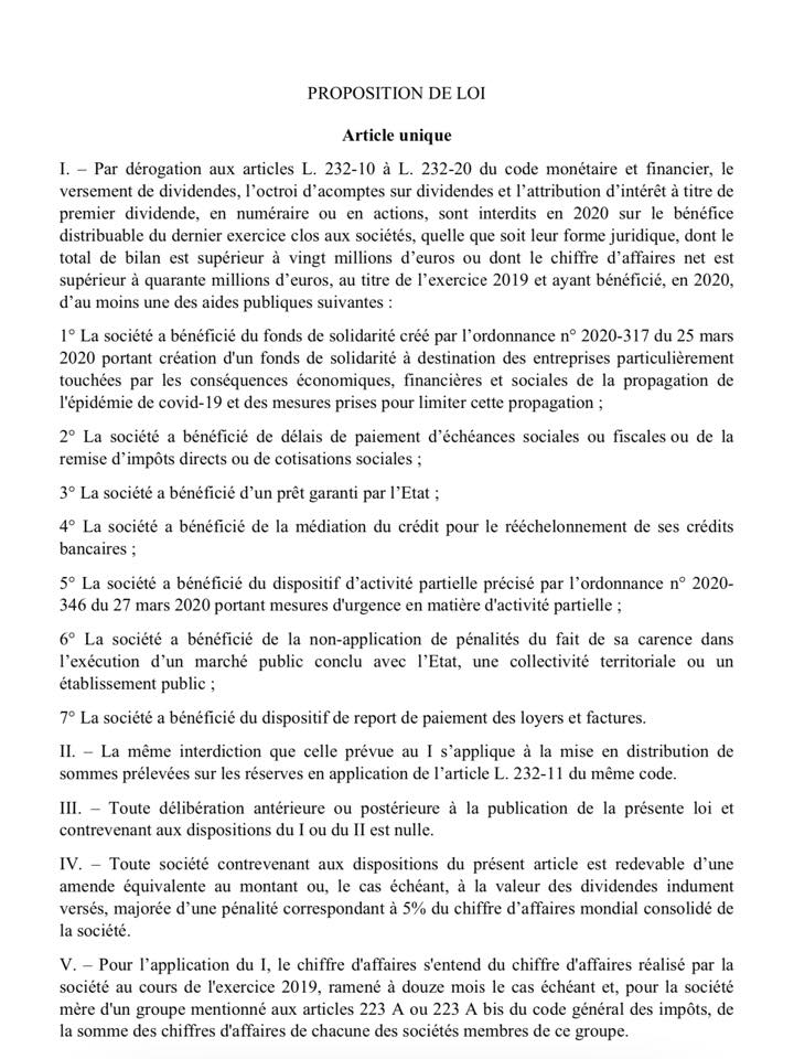 L’article unique interdit donc le versement de dividendes en 2020 aux sociétés, quelle que soit leur forme juridique, ayant bénéficié d’au moins une des aides directe ou indirecte de l’Etat mises en œuvre pour amortir les effets économiques de la crise.