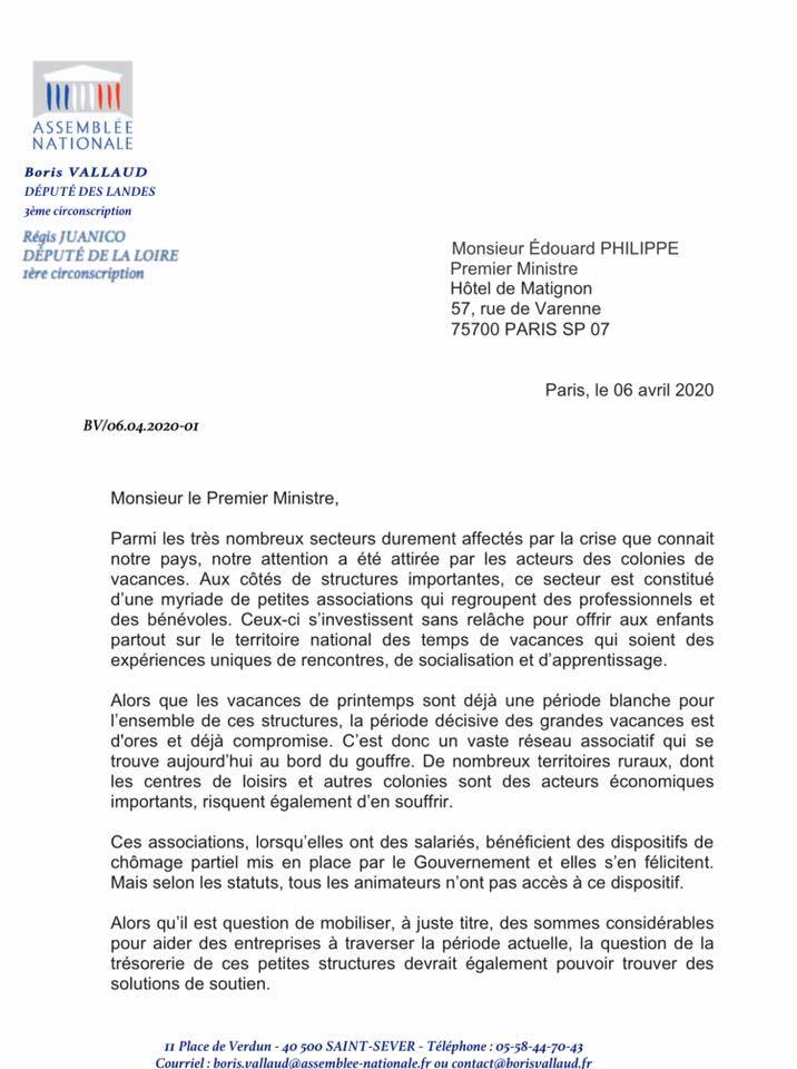 Vous remerciant par avance de l’attention que vous porterez aux alertes et propositions des acteurs des colonies de vacances, je vous prie d’agréer, Monsieur le Premier Ministre, l’expression de notre haute considération.