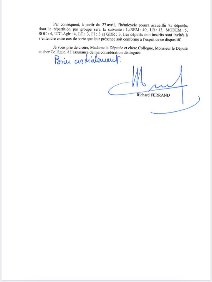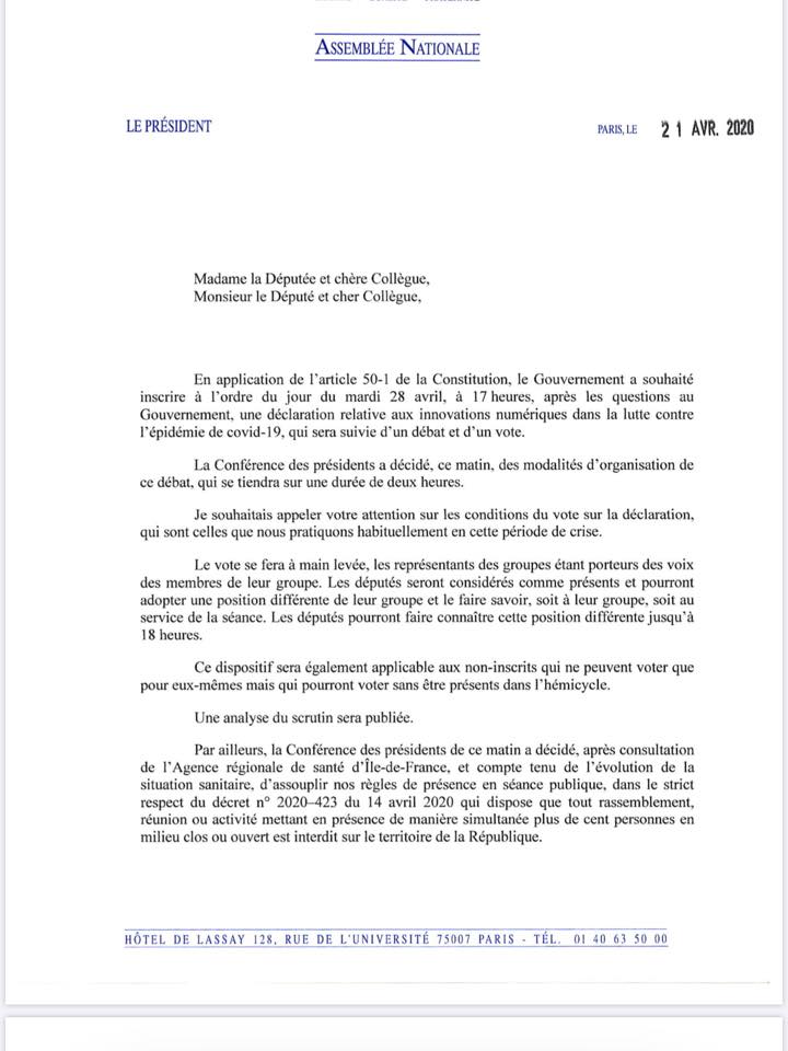 Initialement, le gouvernement avait prévu un débat à l’Assemblée Nationale puis au Sénat sans vote… Suite à notre courrier au Premier Ministre (voir ci-dessous) pour obtenir un vote solennel sur le « tracing », celui-ci aura bien lieu à l’issue du débat dans l’hémicycle mardi 28 avril, comme vient de nous le confirmer le Président de l’Assemblée Nationale Richard Ferrand (voir ci-dessous). Ce n’est pas un point de détail, car le vote, c’est ce qui distingue le débat parlementaire de la causerie, du colloque.
