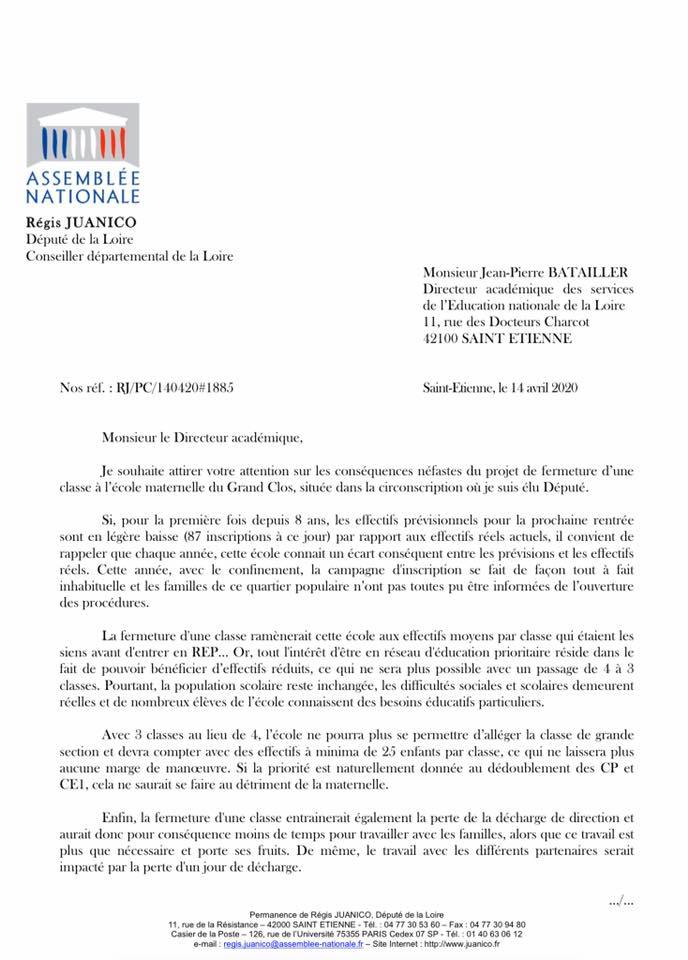 Si les élus de la ville de Saint-Etienne ont exprimé dans un communiqué de presse leur satisfaction en indiquant qu’aucun poste de professeurs des écoles ne seraient supprimés à Saint-Etienne, nous avons avec Pierrick Courbon et Arlette Bernard écrit au Directeur Académique pour dire notre opposition à la fermeture de ces classes.