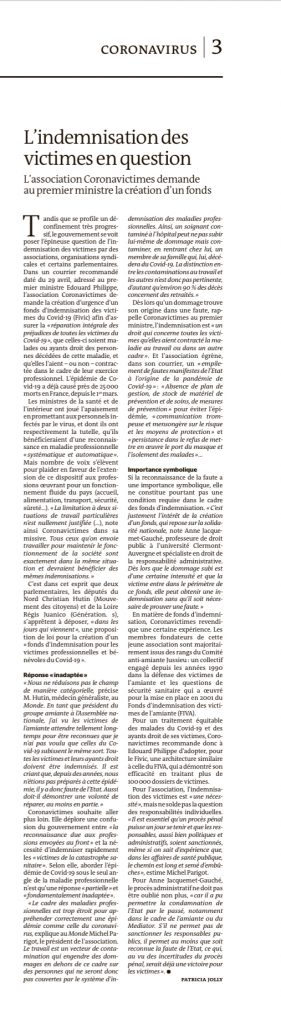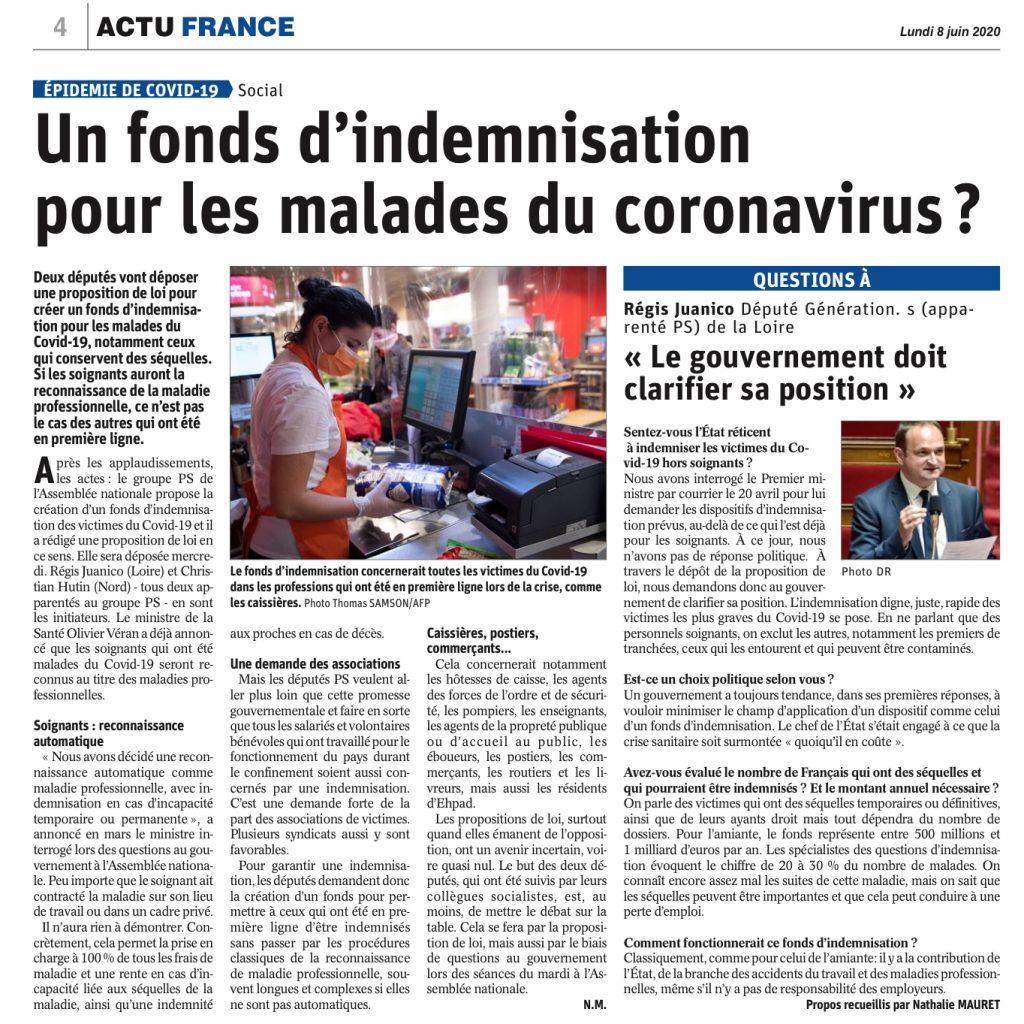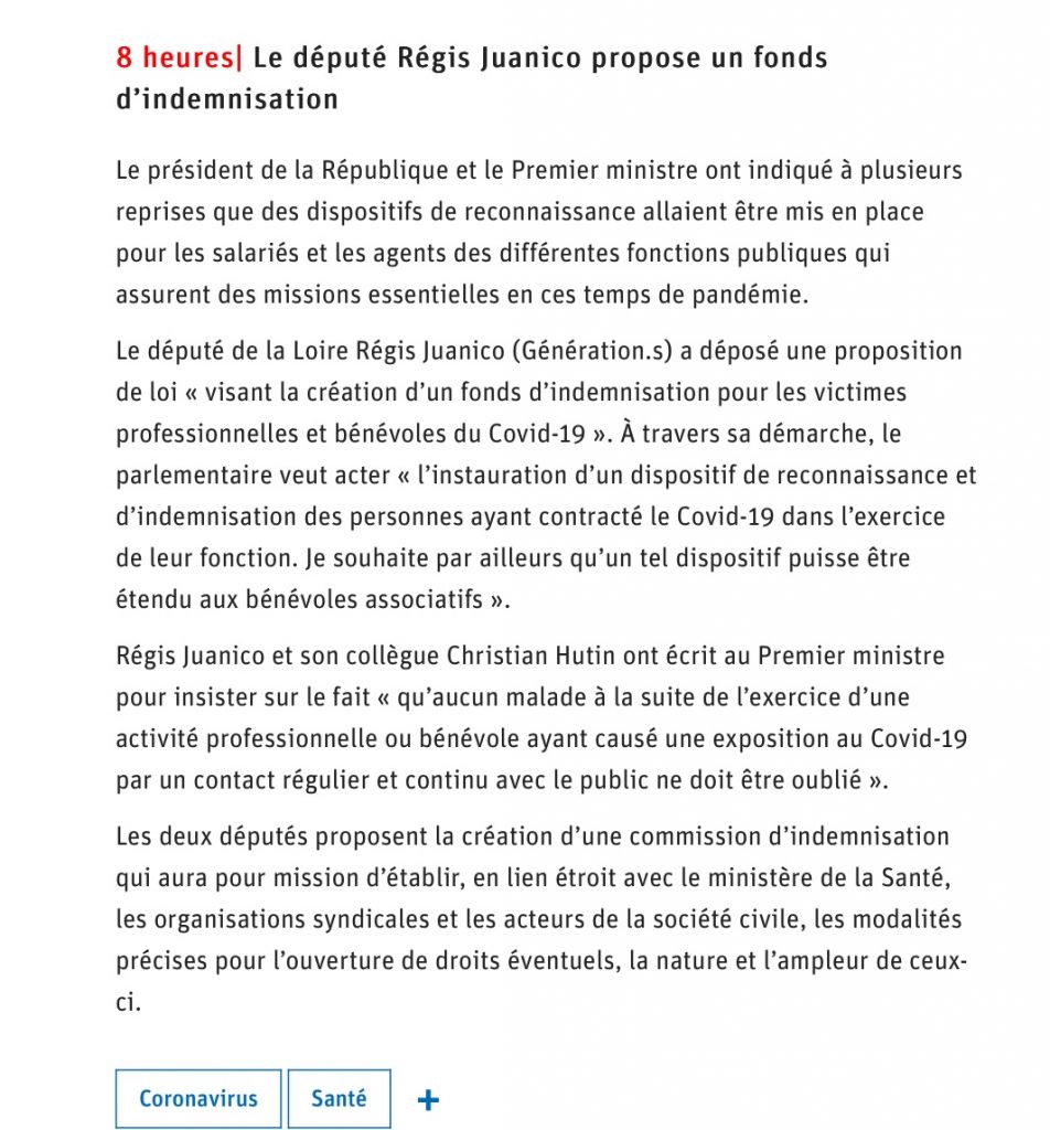 Les Députés Juanico (Loire) et Hutin (Nord) vont déposer une proposition de loi pour la création d’un fonds d’indemnisation pour les victimes professionnelles et bénévoles du Covid-19. Lire la suite