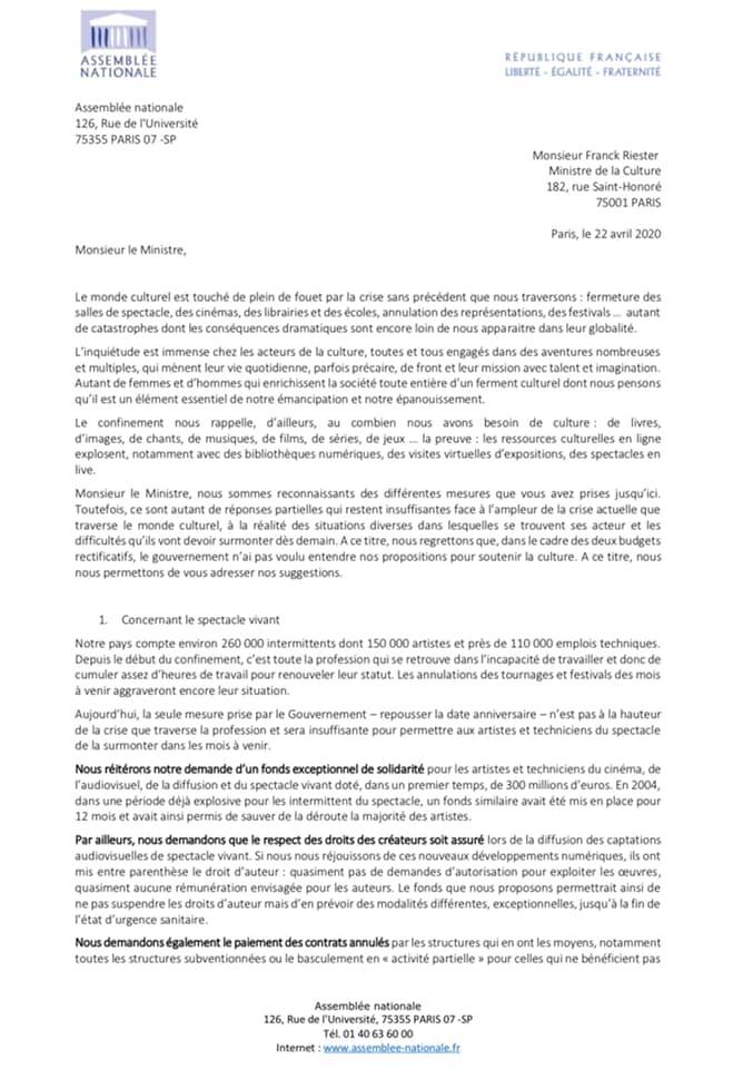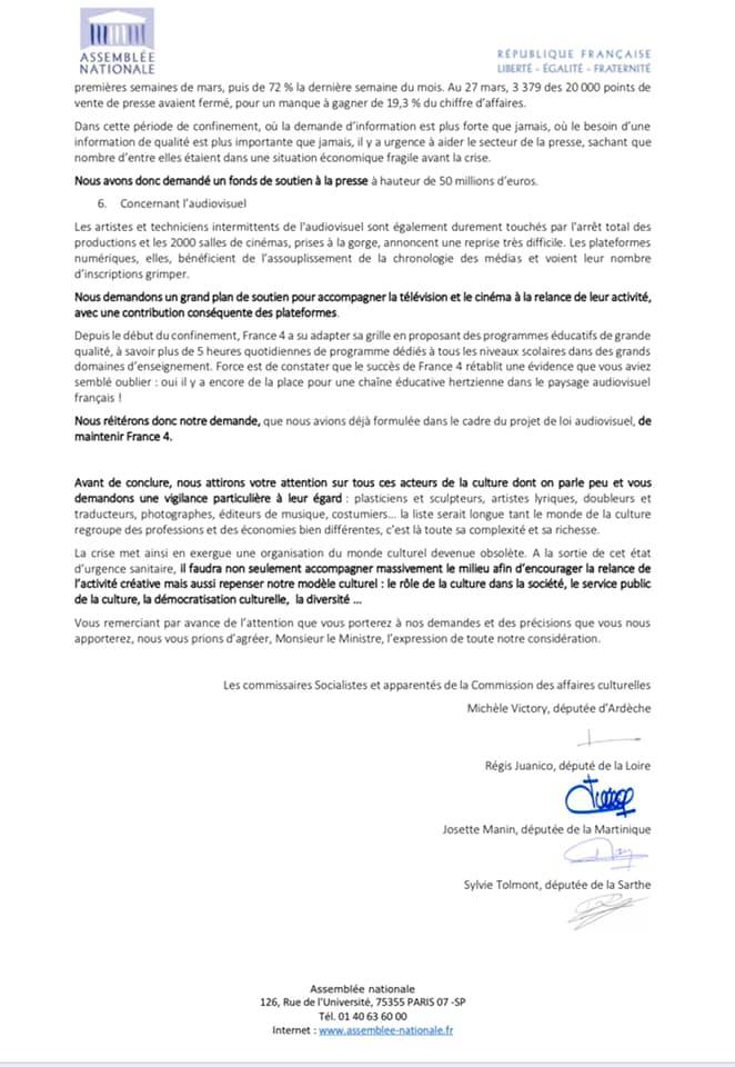 Plus largement, nous avons écrit avec les collègues Michèle Victory, Sylvie Tolmont et Josette Manin au Ministre pour évoquer les multiples problèmes du secteur culturel.