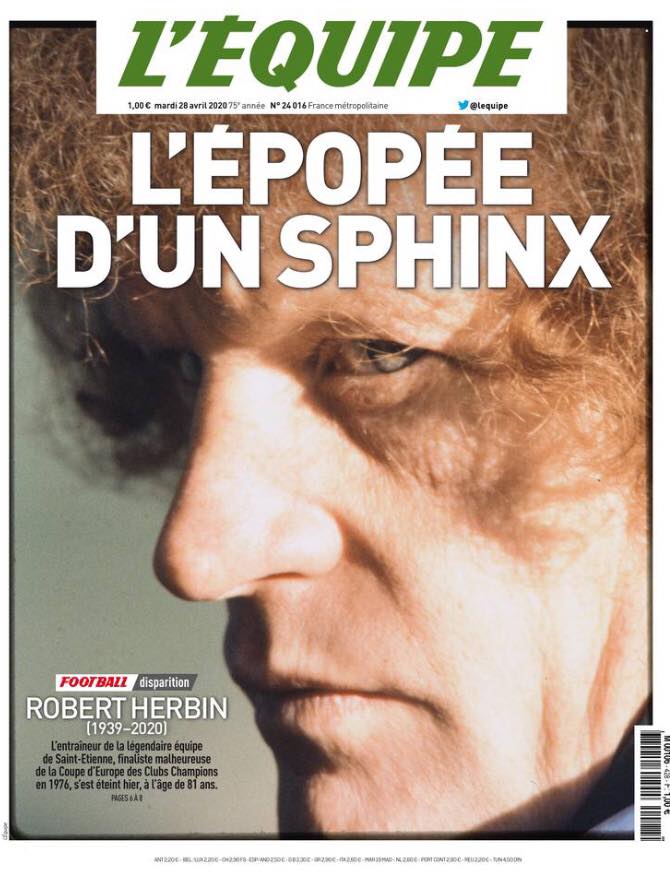 Quelques semaines après la disparition de Michel Hidalgo, la Une de l’Equipe est en vert et forcément en noir tant Robert Herbin était une figure respectée dans le milieu du ballon rond.
